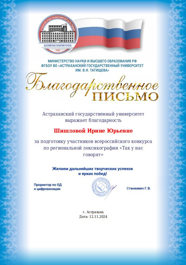 По условиям конкурса, организованного факультетом иностранных языков Астраханского государственного университета имени В. Н. Татищева, требовалось выполнить словарное описание лексики любого региона России на русском и английском языках.