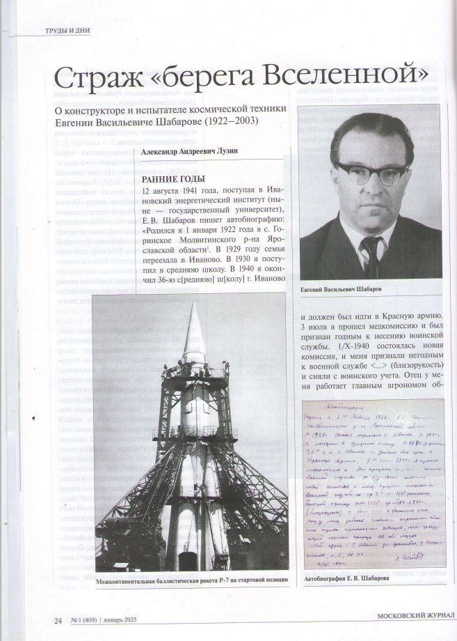 В первом номере за этот год «Московского журнала», имеющего подзаголовок «История государства Российского», вышла статья магистранта 1-го курса (направление подготовки «История») Александра Лузина. Она посвящена конструктору и испытателю космической техники Евгению Васильевичу Шабарову (1922–2003).