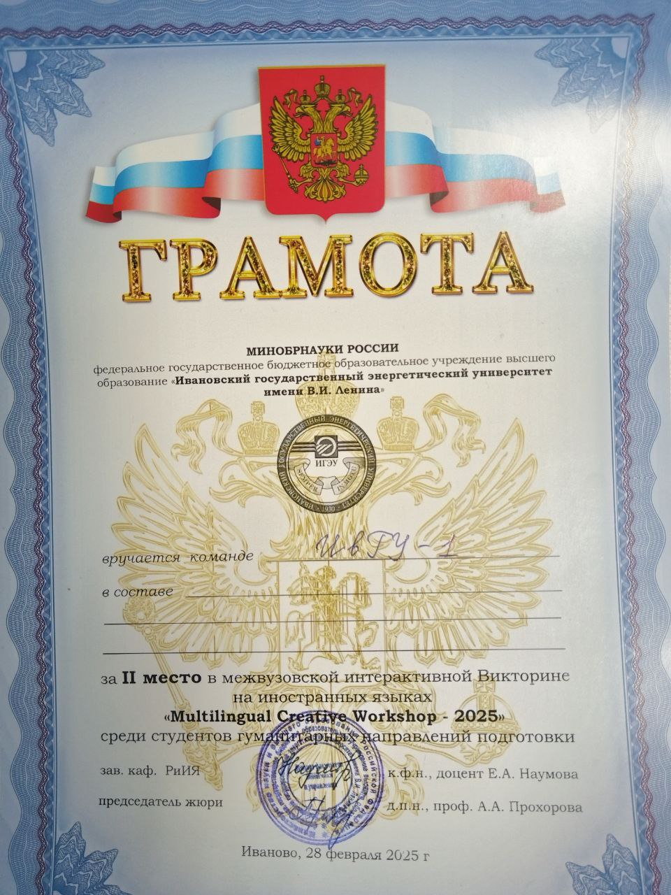 28 февраля 2025 г., в последний день календарной зимы, студенты ИвГУ, ИГЭУ, РАНХиГС (Ивановский филиал) и Шуйского филиала ИвГУ собрались в стенах Ивановского государственного энергетического университета, чтобы поучаствовать в «Мультилингвальной творческой лаборатории». Для участников были предложены задания различного уровня сложности на 5 языках: английском, русском, немецком, французском и испанском. Особенность конкурса в том, что многие студены изучают только один иностранный язык и не знают других. Поэтому поиск правильных ответов превратился в увлекательный квест. Это были задания на поиск соответствий пословиц и поговорок на различных языках, разгадывание кроссвордов, перевод известных песен с одного языка на другой, игра в ассоциации и решение ребусов.