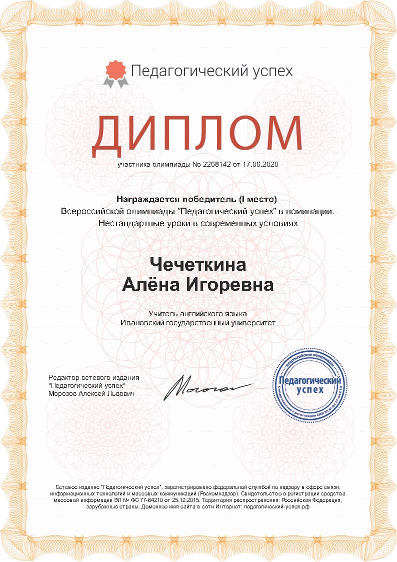 - 1-е место во Всероссийской олимпиаде «Педагогический успех» в номинации «Нестандартные уроки в современных условиях»