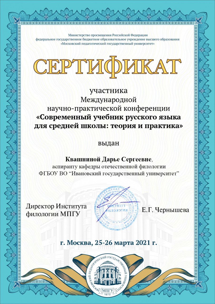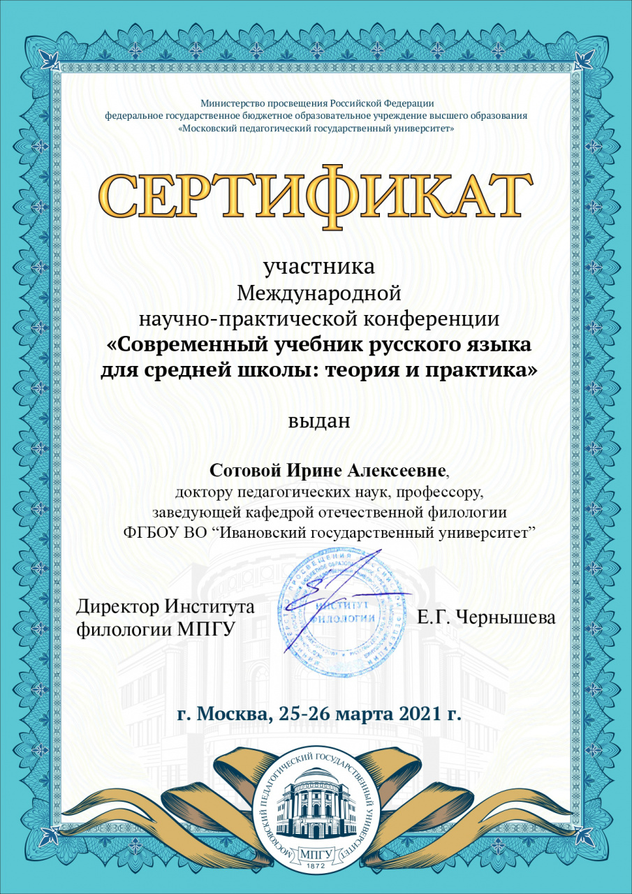 25 марта 2021 г. зав. кафедрой отечественной филологии, д.п.н., проф. И.А. Сотова и аспирант Д.С. Квашнина выступили на пленарном заседании международной научно-практической конференции «Современный учебник русского языка для средней школы: теория и практика», организованной кафедрой методики преподавания русского языка Института филологии Московского педагогического государственного университета (Москва, 25–26 марта 2021 года).