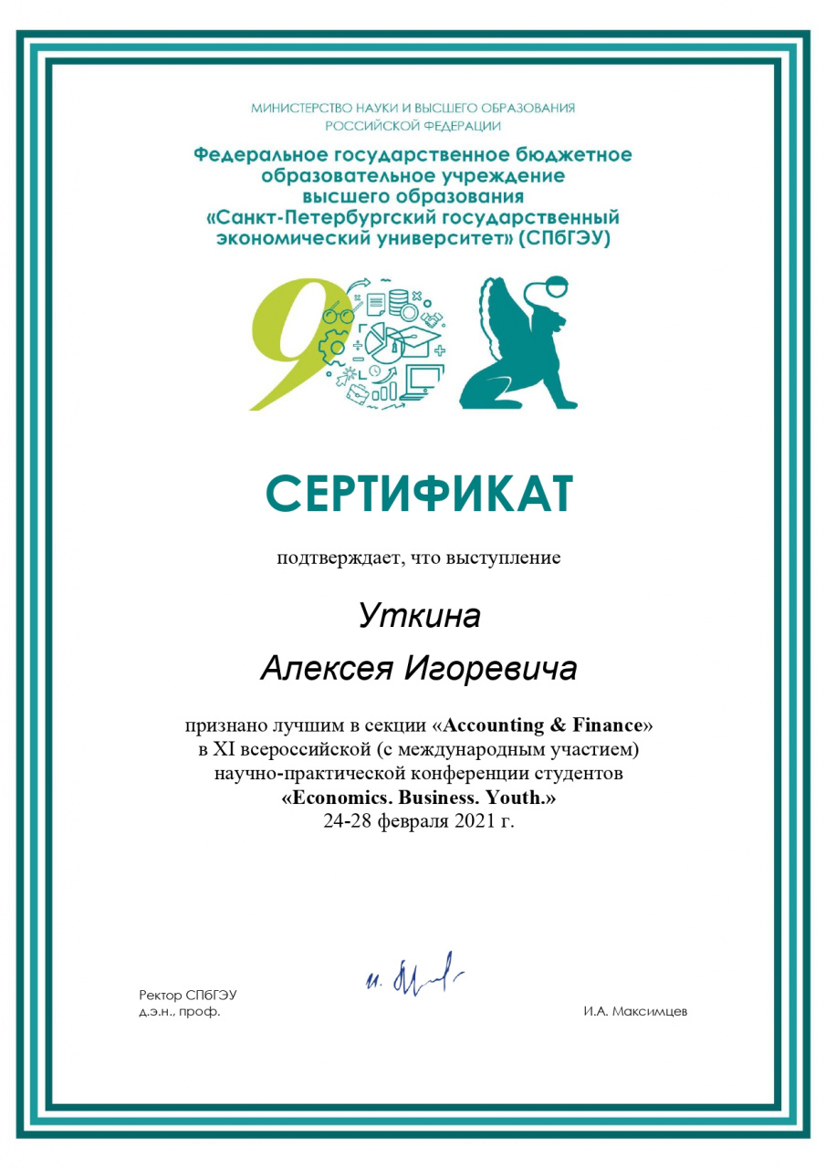 На секции “Accounting and Finance” наш магистрант Алексей Уткин выступил с видеодокладом на английском языке на тему “Application of the Markowitz Model and the Balanced Scorecard Concept in the Statistical Analysis of Exchange Rates in Conditions of Post-Pandemic Banking Risks” (научный руководитель – кандидат технических наук, доцент кафедры финансов, бухгалтерского учета и банковского дела Шитик Елена Владимировна). Это доклад был признан лучшим выступлением, а сам Алексей был признан победителем и награжден Сертификатом за лучшее выступление. К изданию утвержден индексируемый в наукометрической базе РИНЦ сборник материалов конференции, где будет опубликована работа Алексея Уткина.