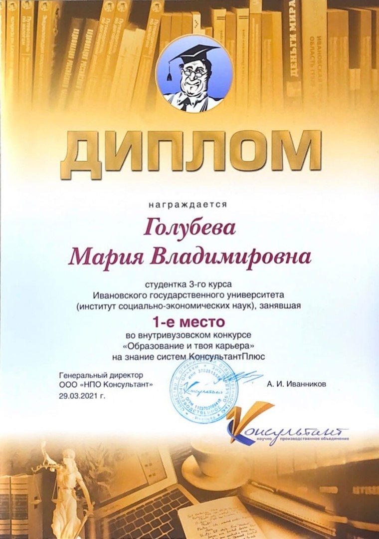 30 марта состоялось награждение победителей первого, внутривузовского, этапа конкурса «Образование и твоя будущая карьера», проводимого ежегодно компанией «Консультант». От Института социально-экономических наук в конкурсе участвовали 137 студентов разных курсов и профилей. Первое место среди студентов 3-го курса заняла студентка кафедры экономической теории, экономики и предпринимательства Мария Голубева. Она удостоена Диплома победителя и сертификата, подтверждающего уверенный уровень владения системой «КонсультантПлюс».