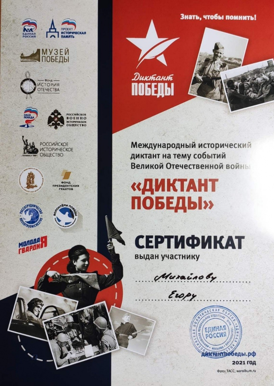 29 апреля 2021 г. студенты 1-го курса (ЭПиО) приняли участие в Диктанте Победы, проходившем на площадке ИвГУ. Это Михайлов Егор (староста группы), Баранова Анна, Кустиков Андрей, Усова Татьяна, Шеломанова Анна, Соловей Валерия.