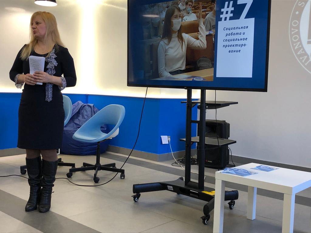 Институт социально-экономических наук распахнул свои двери дорогим абитуриентам и их родителям в «Точке кипения – ИвГУ». Открыли встречу команда Института: директор Курникова И.В., студенты Ярченков Владимир и Михайлов Егор.