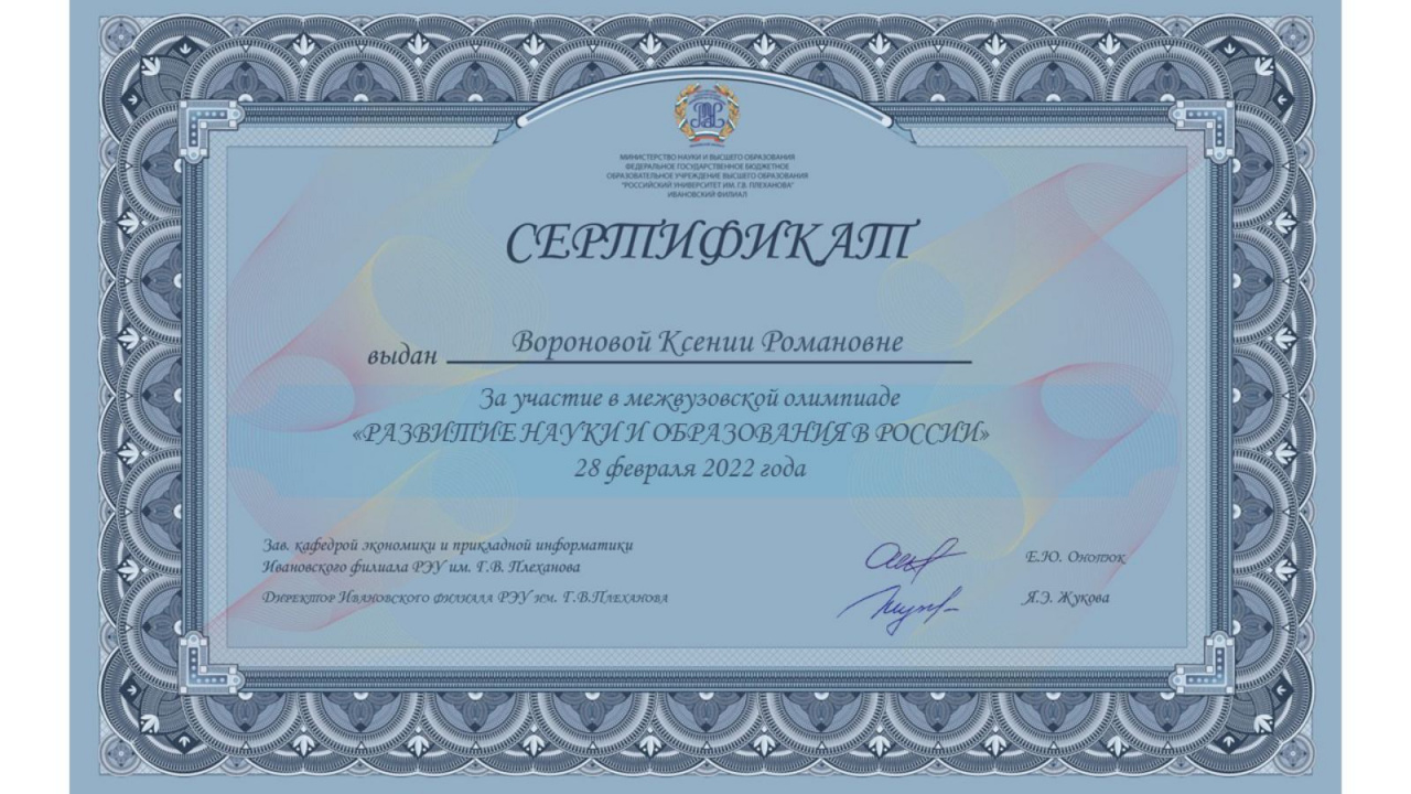28 февраля в Ивановском филиале РЭУ им. Г.В. Плеханова состоялась межвузовская олимпиада «Развитие науки и образования в России», в которой приняла активное участие группа 2-го курса направления подготовки «Управление персоналом» в составе Азизовой Д., Вороновой К., Копыловой А., Комаровой А., Смирновой Ю., Симаковой Н. Целью олимпиады было не только выявить знания, умение представлять полученные в результате анализа материалы, почувствовать атмосферу соперничества, но и принять себя как часть интеллектуального сообщества.