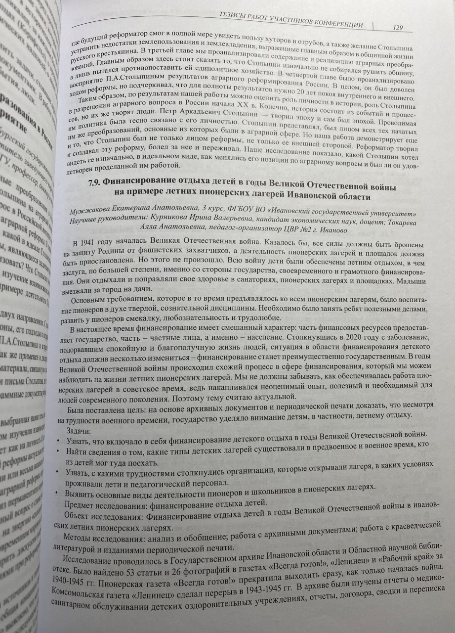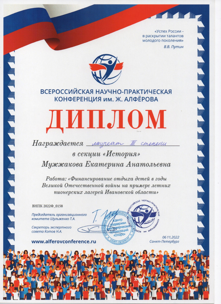 6 ноября состоялось чествование победителей. Мужжакова Екатерина стала лауреатом III степени с работой «Финансирование детского отдыха в годы Великой Отечественной войны на примере летних пионерских лагерей Ивановской области». Свою научную работу Екатерина выполняла под руководством Токаревой Аллы Анатольевны и Курниковой Ирины Валерьевны.