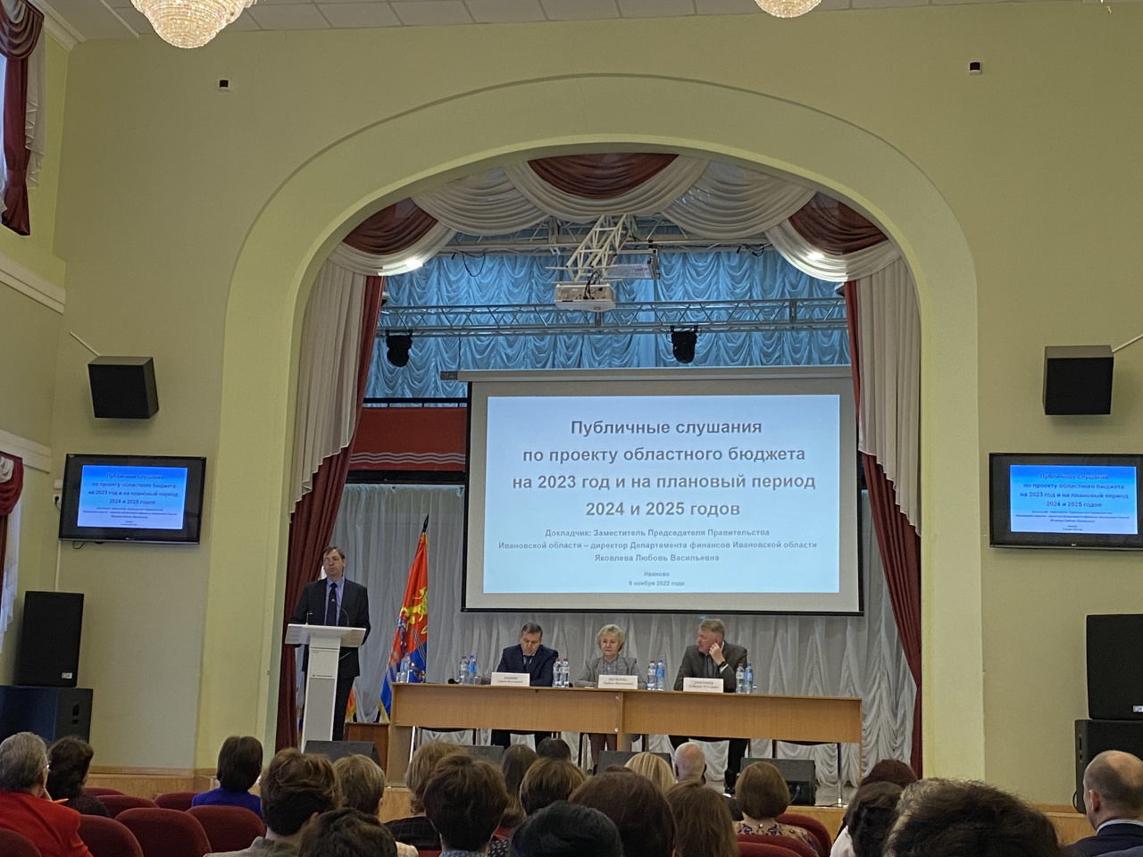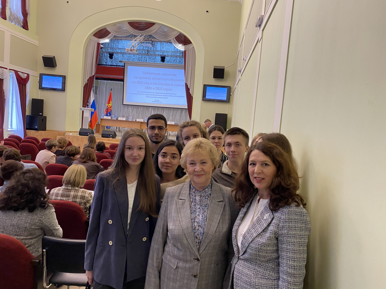 9 ноября в торжественном зале Ивановского Дома национальностей состоялись Публичные слушания по проекту областного бюджета на 2023 год и плановый период 2024 и 2025 годов, где в качестве участников были приглашены студенты 3-го курса по направлению 38.03.01 Экономика «Финансы и кредит» и «Экономика предприятий и организаций» вместе с Директором ИСЭН Курниковой Ириной Валерьевной.