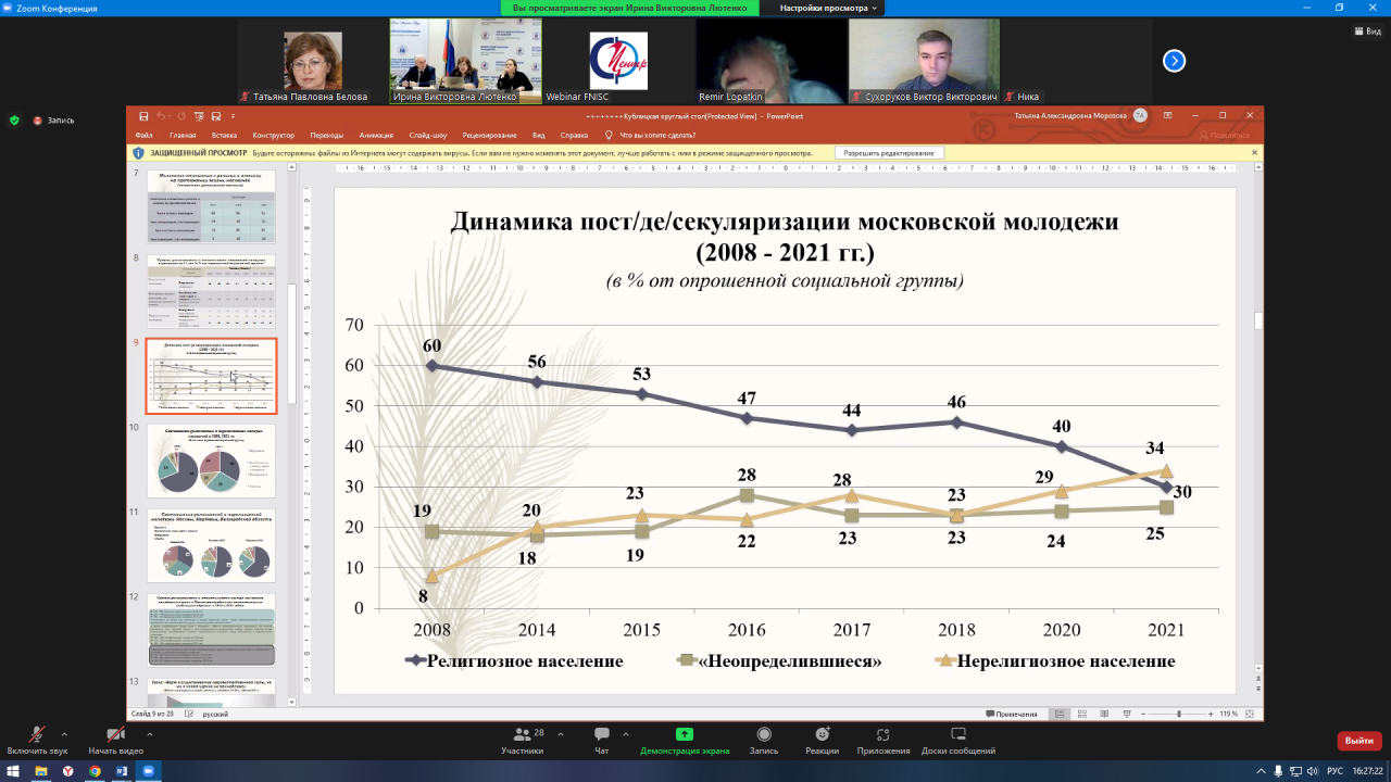 В ходе обсуждения доклада доцент кафедры социологии, социальной работы и управления персоналом ИСЭН Т.П. Белова поделилась результатами своих исследований по молодежи г. Иваново. Полученные данные выявили схожие тенденции секуляризации сознания молодежных групп нашего города и Москвы.