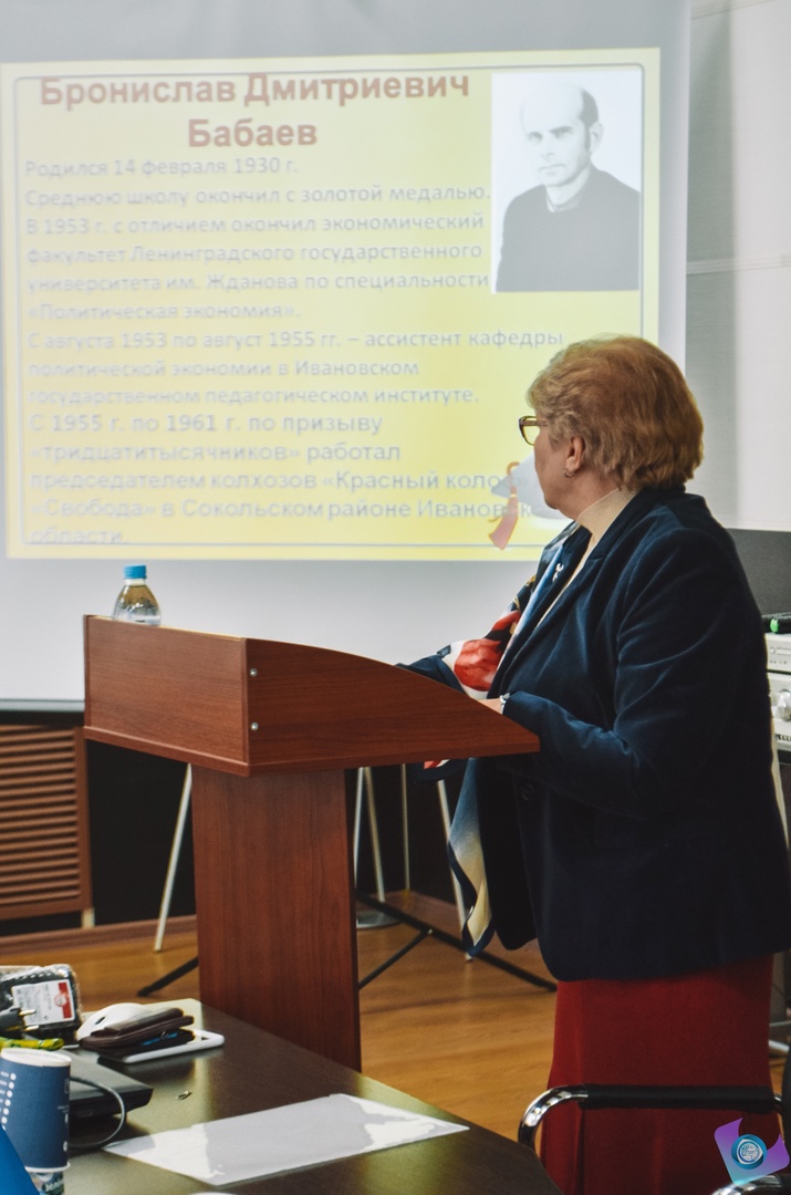 Сын профессора Бабаева, Дмитрий Брониславович Бабаев, канд. экон. наук, доцент, декан факультета экономики и управления Ивановского филиала РАНХиГС, рассказал о трудном военном отрочестве своего отца, его силе духа, стремлении познать новое, о тесной связи его теоретической подготовки с хозяйственной деятельностью как председателя колхозов Сокольского района, о наиболее значимых результатах политико-экономических исследований. В частности, сделал акцент на рассмотрении Б.Д. Бабаевым различных аспектов теории общественного воспроизводства.