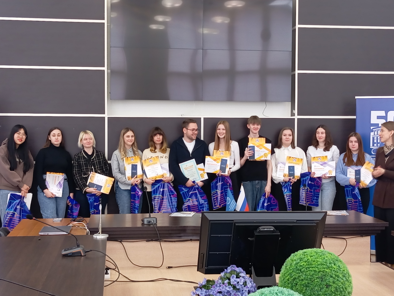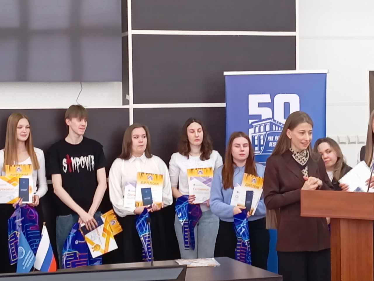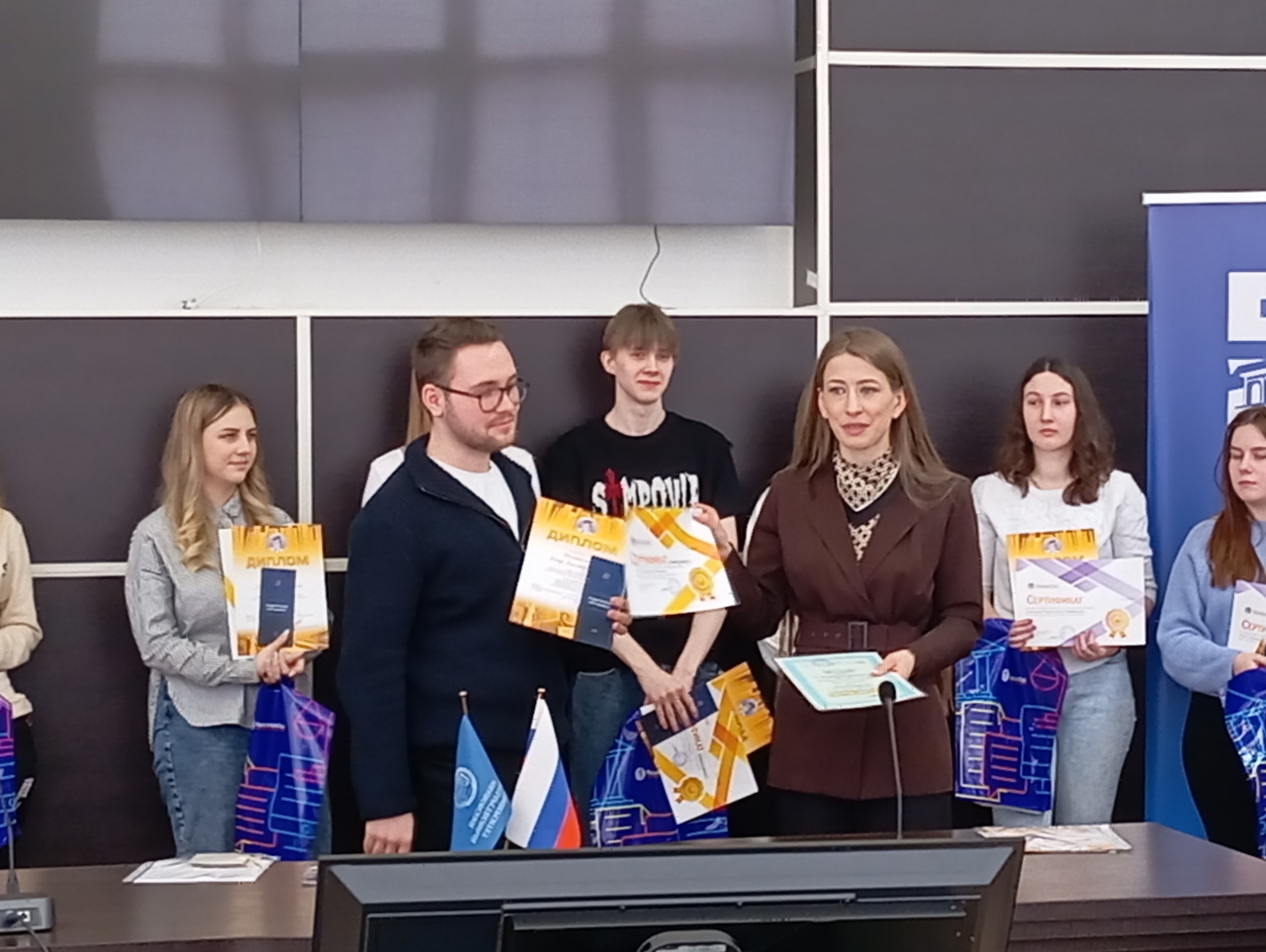 На торжественной церемонии от компании «НТЦ Консультант» выступили: Малинина Д.А. – заместитель генерального директора; Перелетова А.Д. – начальник отдела персонала; Ловцова Е.М. – специалист по работе с персоналом. Они представили результаты конкурса и наградили призеров и победителей, а еще вручили ценные подарки и именную стипендию.