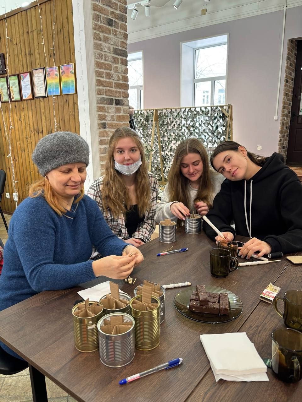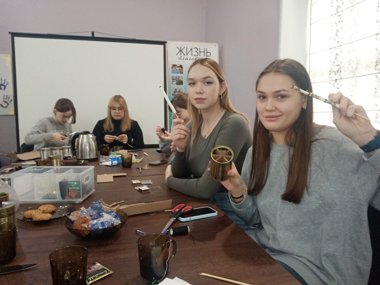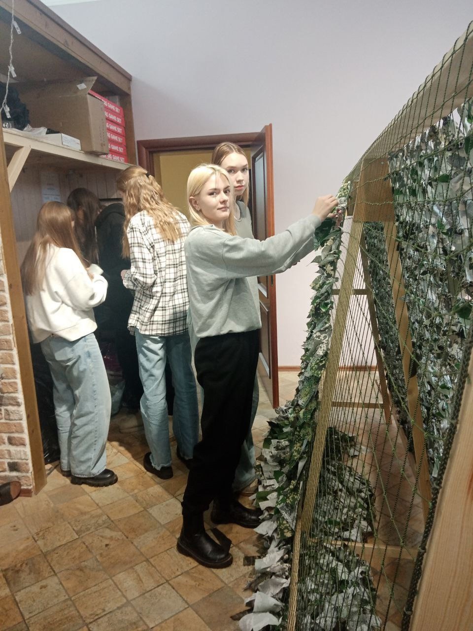 Студенты 3-го курса направлений подготовки «Социальная работа» и «Социология» в рамках дисциплины «Обучение служением» с преподавателем Е.Б. Задорожниковой на базе социально-ориентированной НКО «Благо» плетут маскировочные сети, делают окопные свечи и долго горящие спички, участвуя в процессе организации волонтерской помощи военнослужащим, находящимся в настоящее время на СВО.