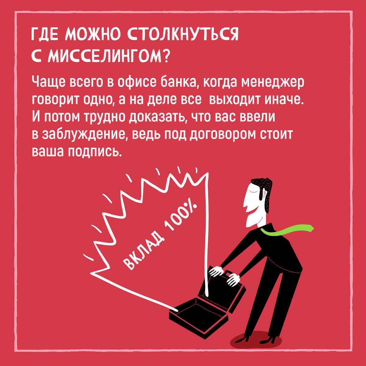 Мисселинг – это, по сути обман. Так называются случаи, когда вас намеренно вводят в заблуждение и пытаются продать не тот товар или услугу, за которыми вы обратились изначально и которые вам нужны на самом деле. Подробнее в карточках.