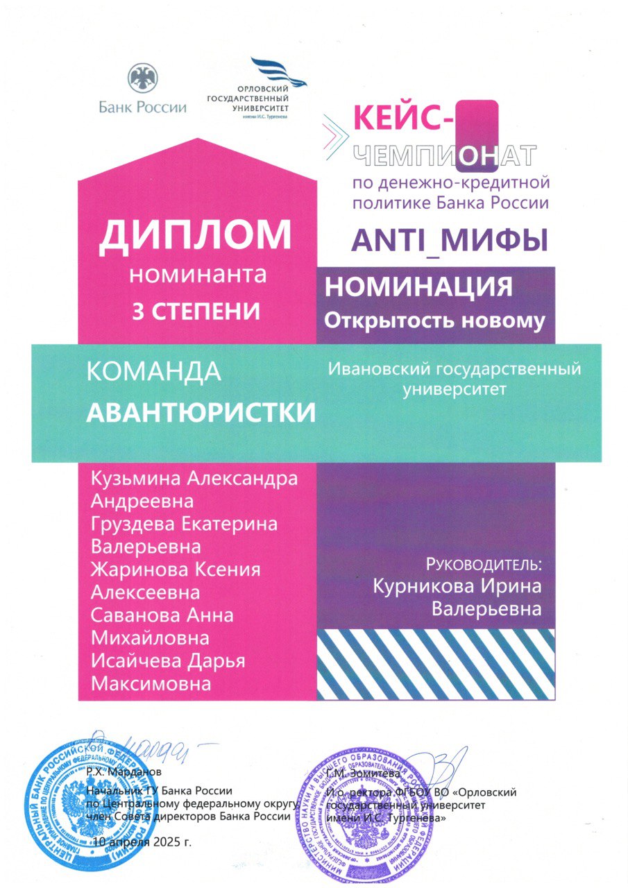Мероприятие проводилось в рамках итогового этапа кейс-чемпионата Центрального федерального округа «ANTI-мифы», прошедшего в апреле 2025 года, в котором участвовали команды четырех вузов г. Иваново. От ИвГУ в кейс-чемпионате приняла участие команда «Авантюристки», это студенты 1, 2 и 3 курса образовательной программы «Финансы и кредит»: Александра Кузьмина, Екатерина Груздева, Ксения Жаринова, Анна Саванова, Дарья Исайчева. Они подготовили на конкурс проект, развенчивающий один из мифов по денежно-кредитной политике Банка России. По итогам чемпионата команда заняла 3 место в номинации «Открытость новому», получив заслуженный диплом и драгоценный опыт участия в конкурсе.