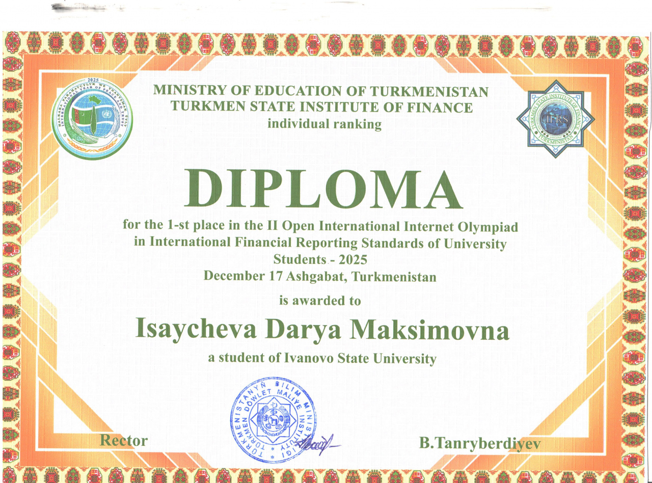 От Института социально-экономических наук участниками выступила команда в составе Жариновой Ксении (4 курс, ОП «Финансы и кредит»); Исайчевой Дарьи и Романовой Анны (2 курс, ОП «Финансы и кредит») под руководством директора Института и руководителя ОП «Финансы и кредит» Ирины Валерьевны Курниковой. Все очень волновались, поскольку олимпиада проводилась в 12:00 (Ашхабадское время) на официальном сайте Туркменского государственного института финансов посредством платформы Moodle по востребованной в настоящее время тематике «Международные стандарты финансовой отчетности». Была проведена серьезная подготовка по вопросам использования финансовой отчётности на международном уровне.