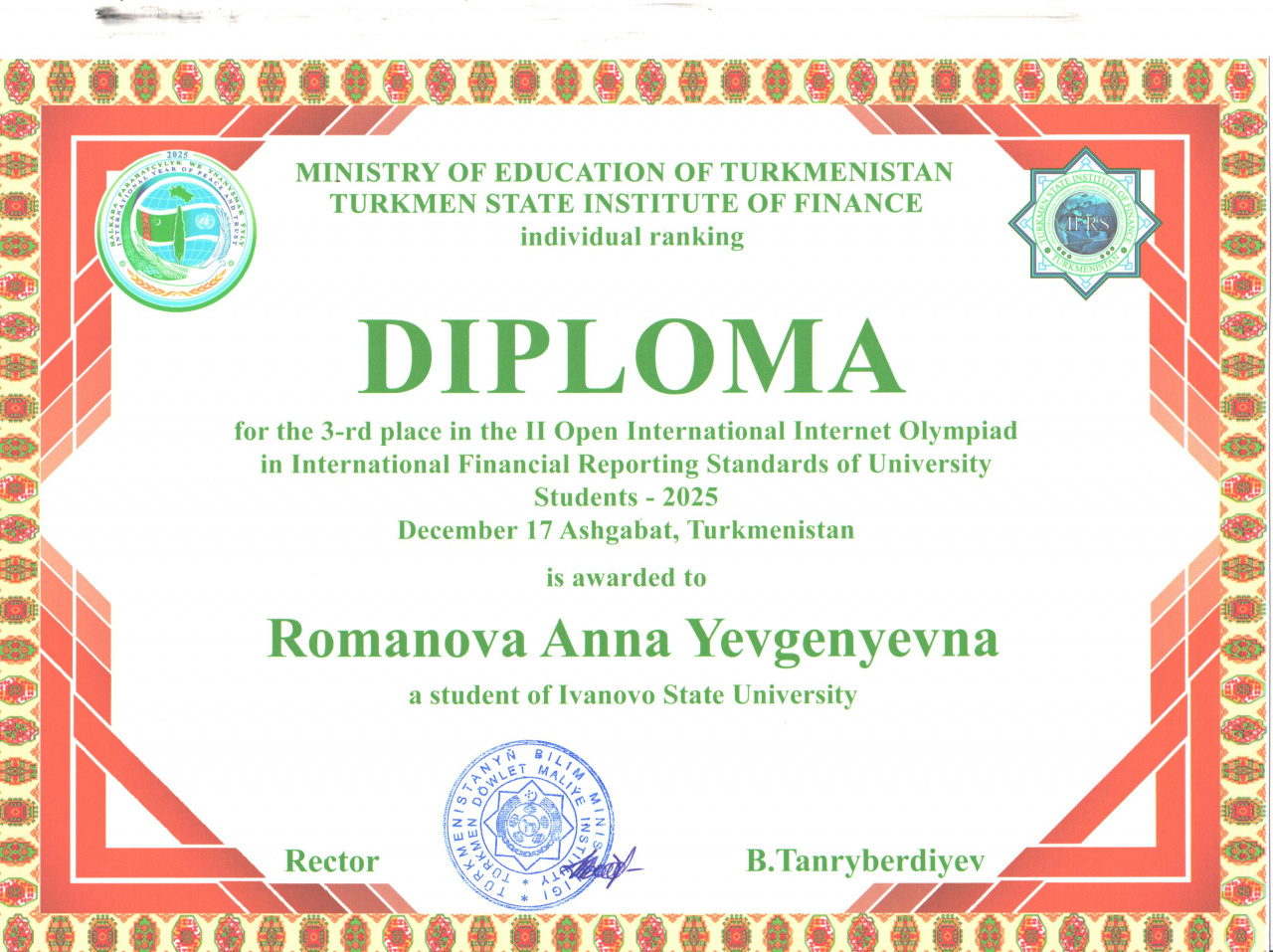 17 декабря 2025 года Туркменский государственный институт финансов (г. Ашхабад) организовал открытую Международную Интернет-олимпиаду среди студентов по дисциплине «Международные стандарты финансовой отчётности». Подробная информация об условиях участия в указанном мероприятии, а также контактных лицах была представлена в ноте Посольства Туркменистана в Российской Федерации от 13.11.2025 № 13/2536.