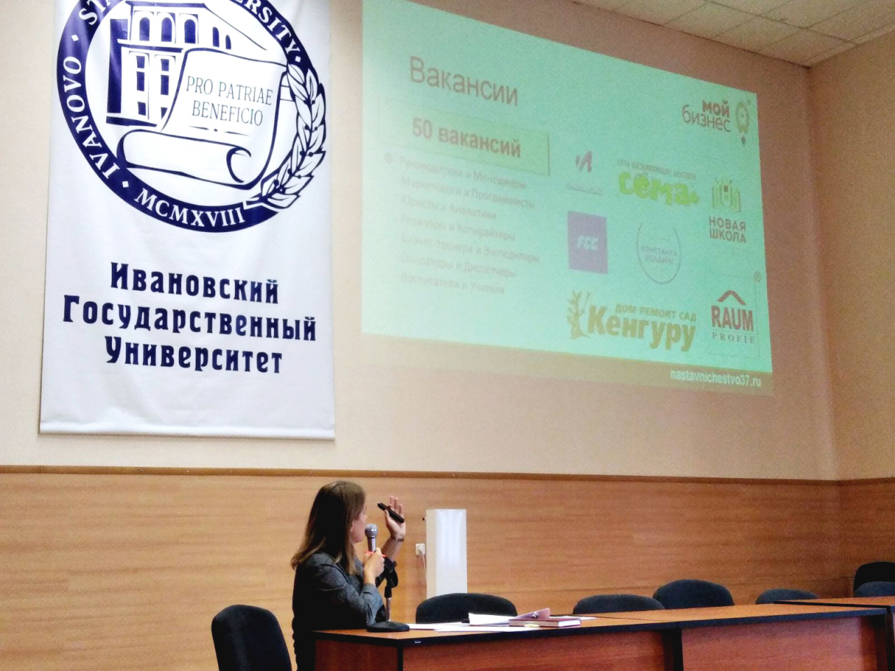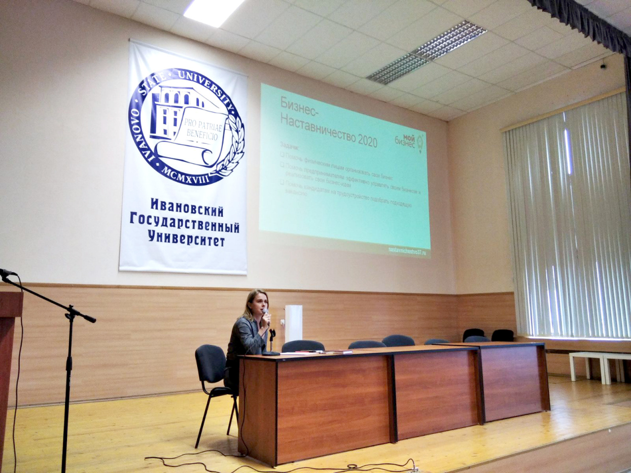 Студенты 4 курса направления «Экономика» (направленности «Экономика предприятий и организаций» и «Финансы и кредит») получили замечательную возможность встретиться с представителями центра «Мой бизнес» и проекта «Бизнес-наставничество 2020» в стенах ИвГУ.