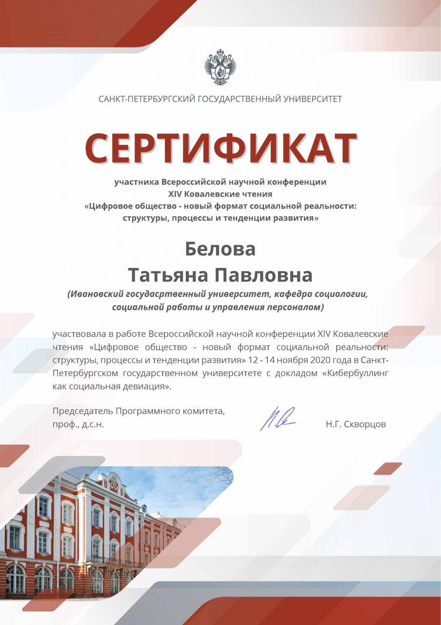 12–14 ноября 2020 года в Санкт-Петербургском государственном университете в online-режиме прошла Всероссийская научная конференция «XIV Ковалевские чтения “Цифровое общество – новый формат социальной реальности: структуры, процессы и тенденции развития”».