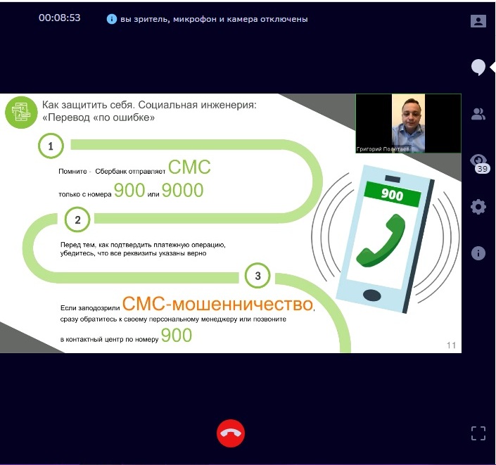 В современных условиях всё чаще выявляются случаи финансовых мошенничеств с банковскими картами и банковскими счетами граждан. Банки и другие финансовые организации проводят активную работу, направленную на повышение уровня безопасности расчетных операций. Одним из направлений такой работы является повышение уровня финансовой грамотности держателей банковских карт. Для решения поставленной задачи специалисты Сбербанка разработали серию обучающих вебинаров в рамках курса «Социальная инженерия».