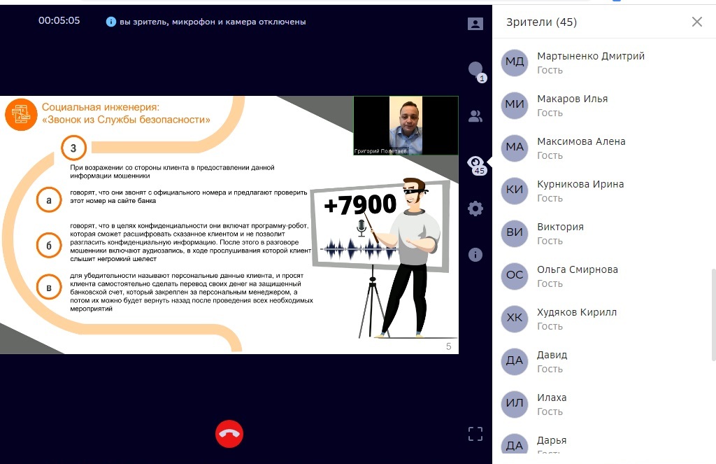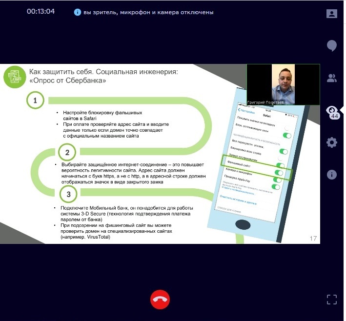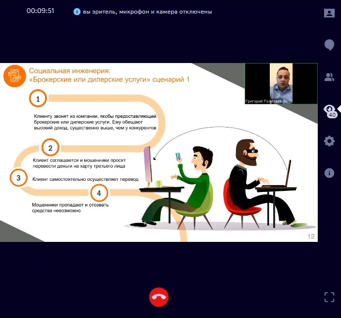 Вебинар провел специалист ивановского отделения «Сбербанка России» Григорий Полетаев. Рассматривались наиболее распространенные ситуации мошеннических действий с банковскими картами. Среди них: звонок из «Службы безопасности»; перевод «по ошибке»; «брокерские» или дилерские услуги; опрос от «Сбербанка». Для каждого из приведенных случаев были рассмотрены признаки недобросовестности и способы защиты. Более подробное описание можно прочитать в предоставленной «Сбербанком» презентации.