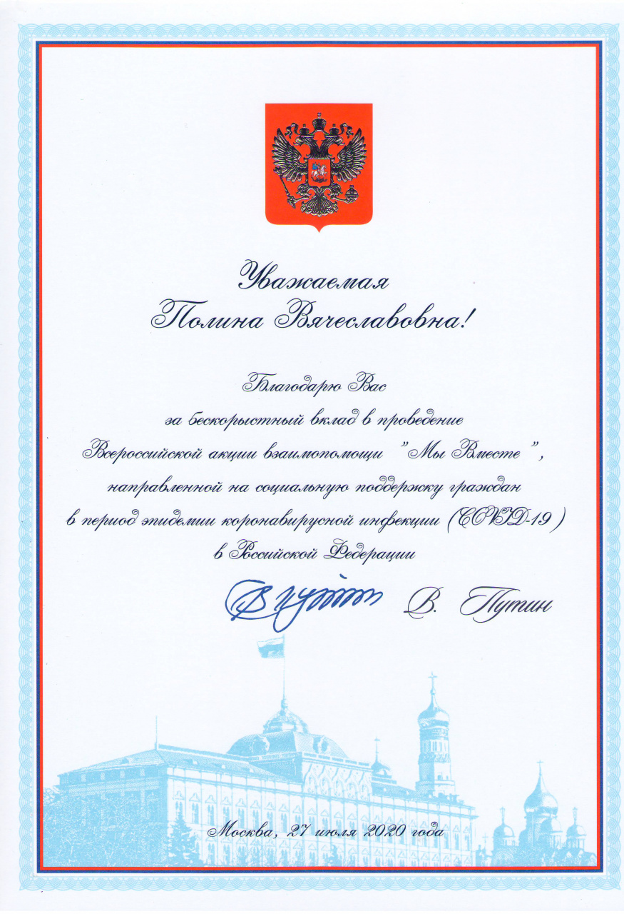 В Белом зале Ивановского государственного историко-краеведческого музея им. Д.Г. Бурылина в торжественной обстановке губернатор Ивановской области Станислав Воскресенский вручил государственные награды за достижения в сфере науки и образования, воспитание детей, общественную деятельность. Полина Вячеславовна Агафонова, преподаватель кафедры социологии, социальной работы и управления персоналом ИвГУ, получила Благодарственное письмо президента Российской Федерации с формулировкой «за бескорыстный вклад в проведение Всероссийской акции взаимопомощи “Мы Вместе”, направленной на социальную поддержку граждан в период эпидемии коронавирусной инфекции (COVID-19) в Российской Федерации» (В. Путин).