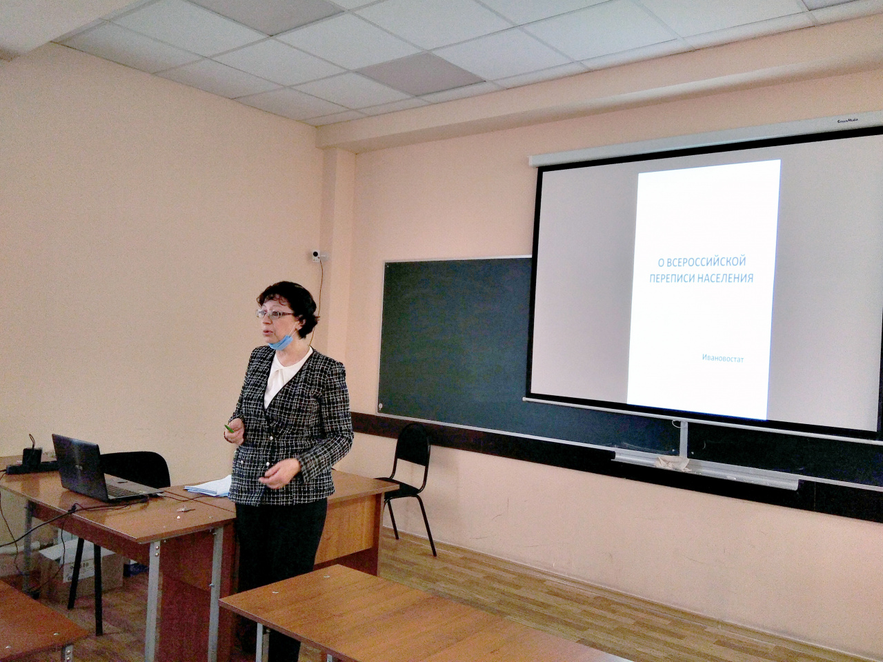 8 апреля в Институте социально-экономических наук ИвГУ было проведено мероприятие по подготовке к проведению Всероссийской переписи населения, которая пройдет в сентябре 2021 года. Оно прошло в рамках Дорожной карты по развитию взаимодействия Ивановского государственного университета и Ивановостата (Территориального органа Федеральной службы государственной статистики по Ивановской области).