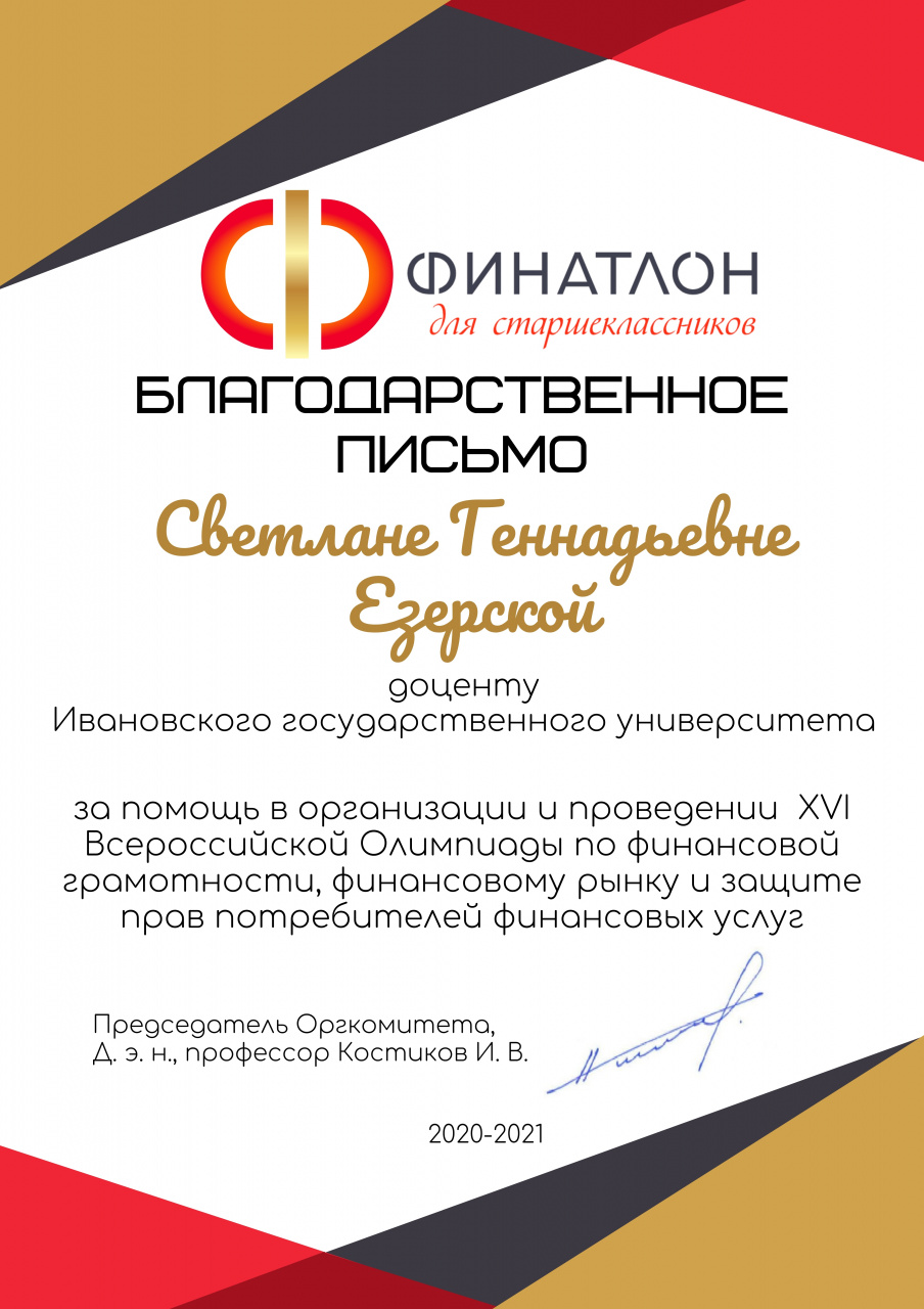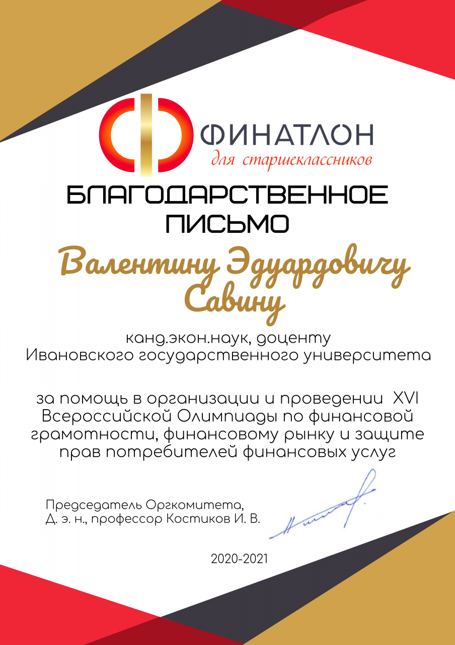 В адрес ректора ИвГУ А.А. Малыгина поступило Благодарственное письмо от ОООП «Финпотребсоюз», в котором выражается искренняя благодарность за организацию и проведение XVI Всероссийской олимпиады по финансовой грамотности,финансовому рынку и защите прав потребителей финансовых услуг: