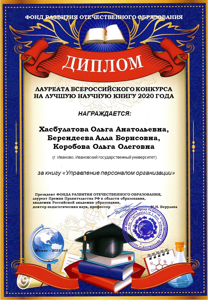 Учебное пособие, подготовленное д-ром исторических наук Хасбулатовой О.А., д-ром экон. наук Берендеевой А.Б. и канд. экон. наук Коробовой О.О., стало «Лучшей научной книгой 2020 года». Пособие составлено на основе отечественных и зарубежных источников, в том числе книг, написанных топ-менеджерами ведущих компаний мира, и получило официальное признание в системе профобразования. Авторы награждены Дипломом Лауреатов Всероссийского конкурса.