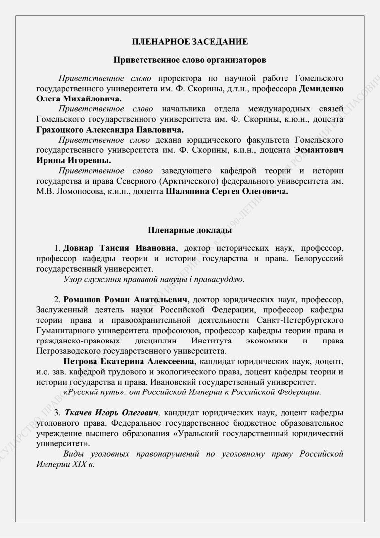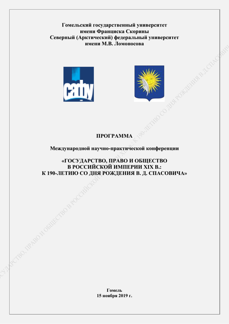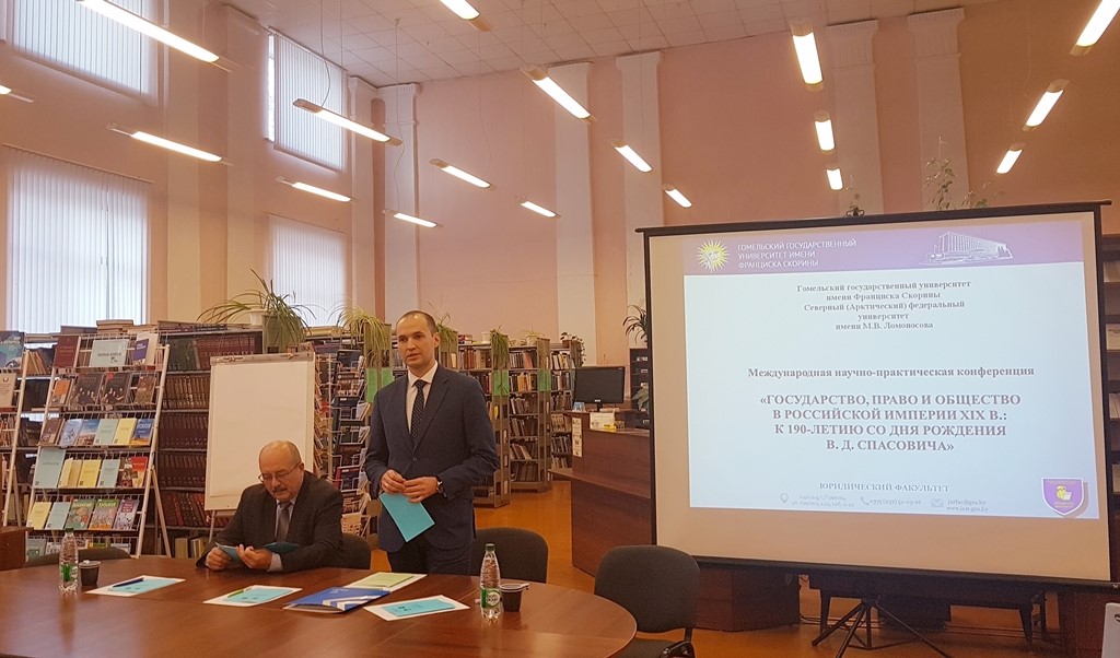 15 ноября 2019 года в Гомельском государственном университете имени Ф. Скорины (г. Гомель, Республика Беларусь) состоялась международная научная конференция «Государство, право и общество в российской империи ХIХ в.: к 190-летию со дня рождения В.Д. Спасовича», организованная совместно с Северным (Арктическим) федеральным университетом имени М.В. Ломоносова (г. Архангельск, Россия). Мероприятие было посвящено обсуждению вопросов, связанных с жизнью и деятельностью В.Д. Спасовича, развитием отраслей права, эволюцией государственного и общественного строя Российской империи в ХIХ в. В работе данной конференции приняла участие и.о. зав. кафедрой трудового и экологического права, доцент кафедры теории и истории государства и права ИвГУ Петрова Е.А., которая подготовила совместный доклад с доктором юридических наук, профессором, Заслуженным деятелем науки Российской Федерации, профессором кафедры теории права и правоохранительной деятельности Санкт-Петербургского Гуманитарного университета профсоюзов Р.А. Ромашовым на тему «Русский путь»: от Российской Империи к Российской Федерации». Выступление было представлено на пленарном заседании в форме видеодоклада, с содержанием которого можно ознакомиться по ссылке.