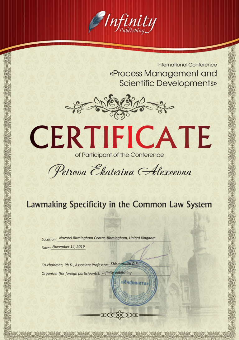 Ею был подготовлен доклад на английском языке на тему: «Особенности правотворчества в системе общего права». Материалы докладов участников конференции опубликованы в сборнике «Process Management and Scientific Developments: Materials of the International Conference, Birmingham, United Kingdom, November 14, 2019. Birmingham, 2019». Также в данный сборник вошел доклад профессора кафедры трудового и экологического права, д.ю.н. Смирновой М.Г. на тему «Институционализации социальных притязаний как инструмент социальных притязаний» (на английском языке). С содержанием сборника можно ознакомиться в ЭИОС в разделе «Публикации».