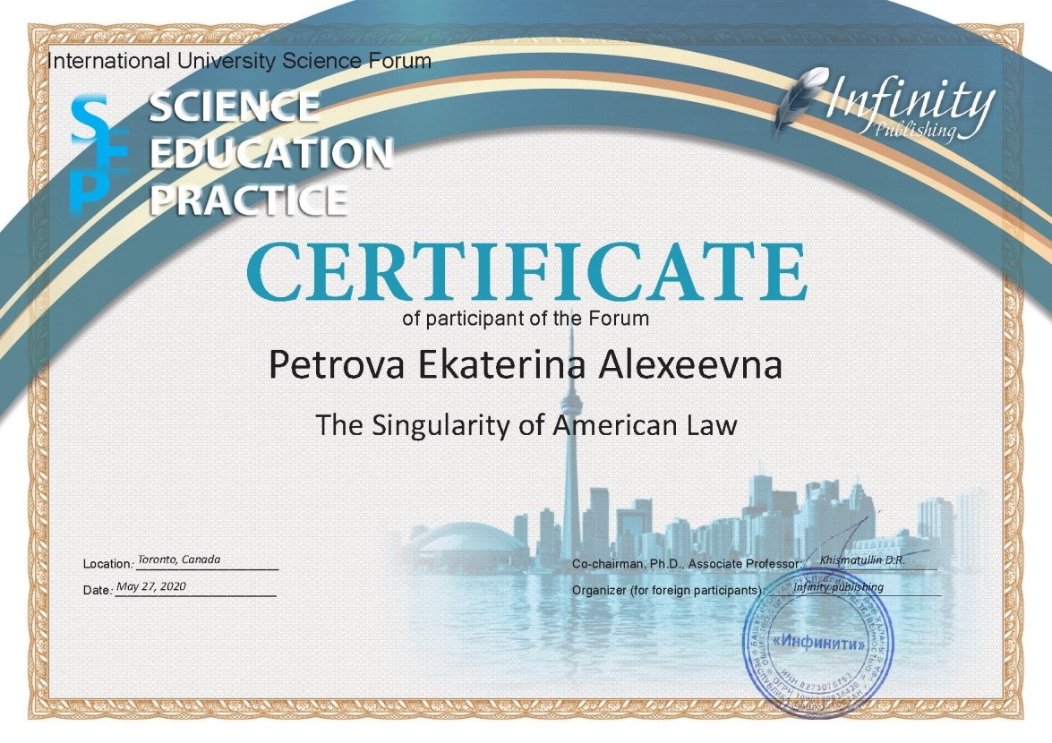 Официальными языками мероприятия были английский и французский. На форуме обсуждались актуальные проблемы гуманитарных, естественных и технических наук. Доцентом Е.А. Петровой был подготовлен доклад на английском языке на тему: «Специфика американского права». Материалы докладов участников конференции опубликованы в научном сборнике “Science. Education. Practice: proceedings of the International University Science Forum (Canada, Toronto), May 27, 2020. Toronto: Infinity Publishing, 2020”. Текст доклада также размещен автором в ЭИОС.