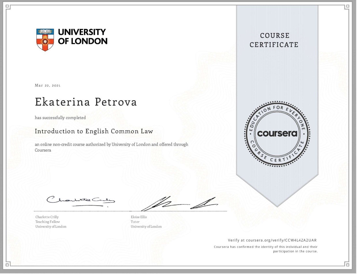 В феврале–марте 2021 года Лондонским университетом (University of London) на образовательной платформе Coursera был организован шестинедельный учебный курс на английском языке по основам английского общего права («Introduction to English Common Law»), в котором приняла участие зав. кафедрой сравнительного правоведения и правотворчества Е.А. Петрова.