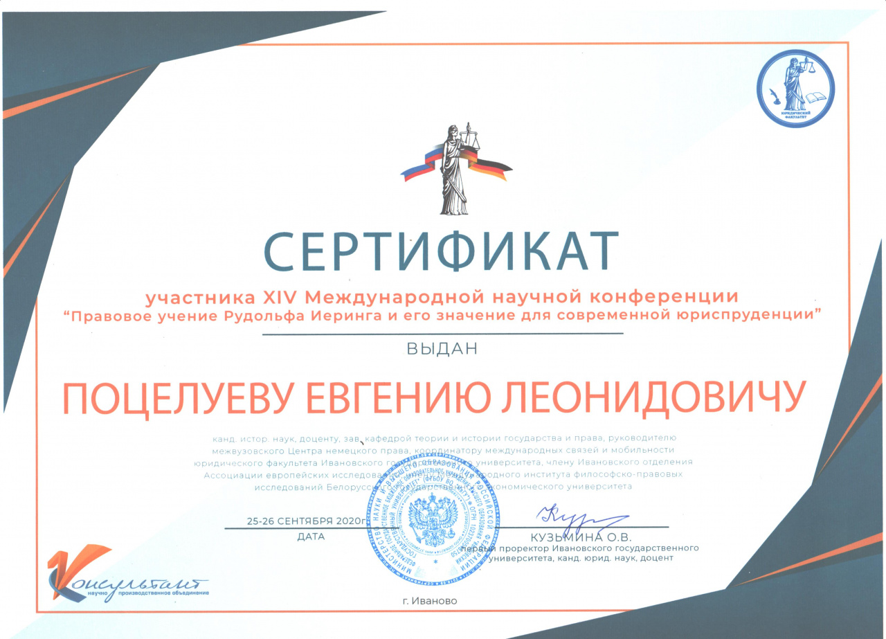 Сертификат Е.Л. Поцелуева, участника XV Международной научной конференции памяти Р. Иеринга. 25–26.09.2020