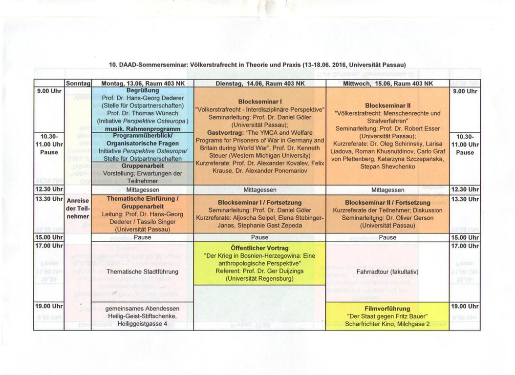 Работа семинара продолжалась с 13 по 18 июня 2016 г. включительно. Рабочий язык – немецкий. Во время открытия звучала живая музыка. С официальным приветствием ко всем присутствующим обратились профессора – Ханс-Георг Дедерер, руководитель представительства «Восточное партнерство», и научный руководитель Инициативы «Перспективы Восточной Европы» Томас Вюнш. Во время его работы все были поделены на мини-группы, каждая из которых решала конкретные задачи, например, с законностью операции по уничтожению спецподразделением США Бен Ладена на территории суверенного государства – и т.п. За это время все участники выступили с докладами. Доклад Е.Л. Поцелуева был посвящен международному терроризму, продолжался более 20 минут и сопровождался презентацией. Перед участниками выступали ученые из университетов ФРГ (Мюнхен, Пассау и Регенсбург), Нидерландов и США. Прекрасными руководителями были доктора, профессора Университета Пассау Ханс-Георг Дедерер, Хольм Путцке, Роберт Эсер и др.