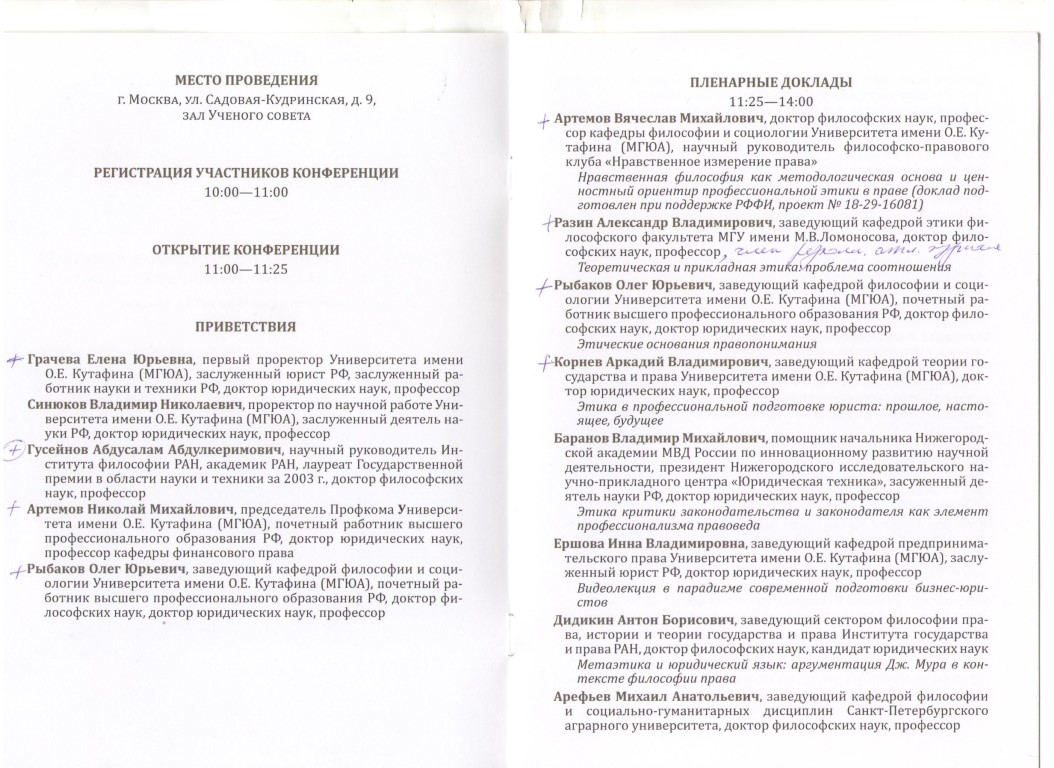 Весьма интересными, содержательными, актуальными были выступления известных российских теоретиков права – докторов юридических наук, профессоров – Сергея Васильевича Липеня («Право и этика конфликта и компромисса»), автора учебников и хрестоматий по теории государства и права (соавтор этой учебной литературы – д.ю.н., профессор А.В. Лазарев); Татьяны Васильевны Кашаниной («Зависит ли нравственность человека от его психофизиологии?»), автора учебных пособий о происхождении государства и о юридической технике; Аркадия Владимировича Корнева («Этика в профессиональной подготовке юриста: прошлое, настоящее, будущее»), заведующего кафедрой теории государства и права. Его выступление, как и всегда, было ярким, эмоциональным, практикориентированным и посвященным защите такого фундаментального принципа права (и одновременно ценности), как справедливость. А справедливость, гуманизм, добросовестность приходится отстаивать, поскольку есть влиятельные ученые-юристы, выступающие за то, чтобы исключить их из российского законодательства – УК РФ, ГК РФ и др. Все три оратора ярко представили кафедру теории государства и права МГЮА. С темой «Статус муниципального депутата и проблема нравственной коррупции» выступил к.ю.н., депутат Совета городского округа Краснознаменск Виталий Владиславович Вышкварцев, который привел этико-правовые примеры из деятельности представительных органов местного самоуправления.