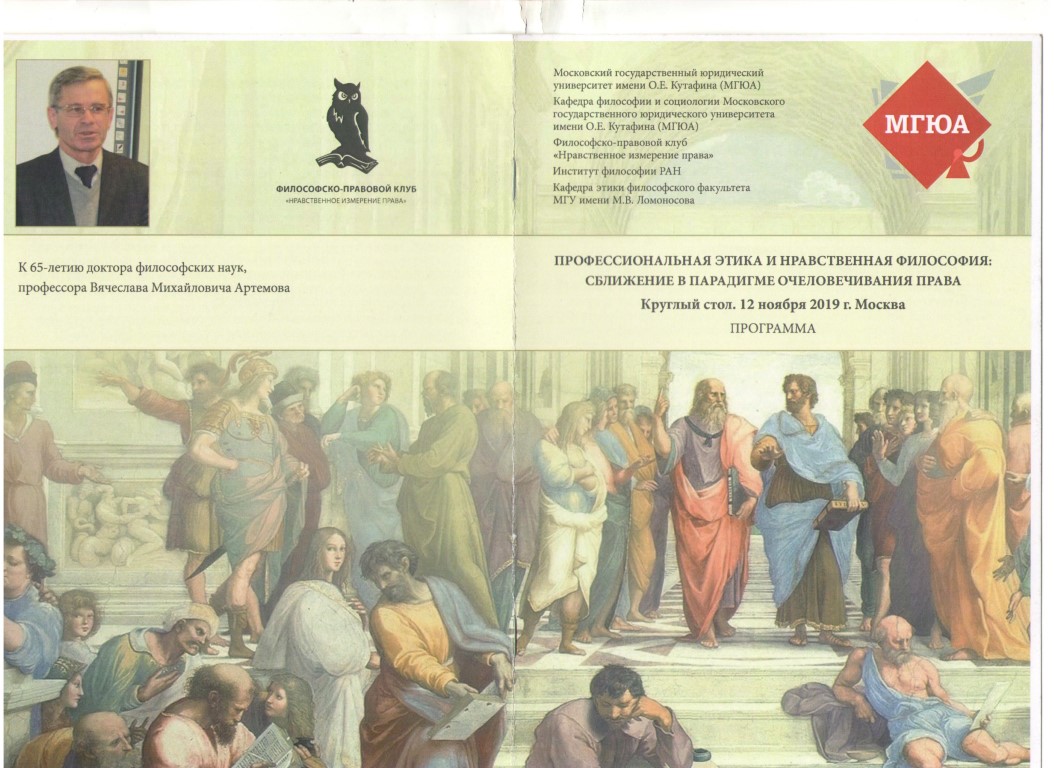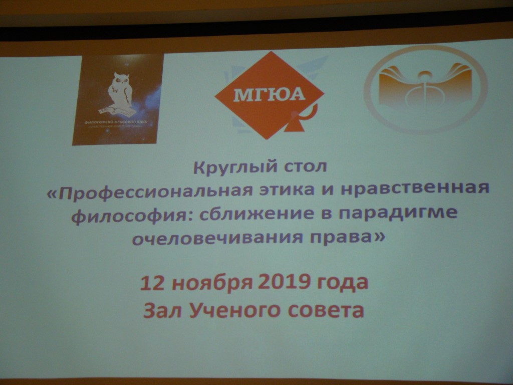 12 ноября 2019 г. в Московском государственном юридическом университете имени О.Е. Кутафина (МГЮА) состоялся круглый стол на тему «Профессиональная этика и нравственная философия: сближение в парадигме очеловечивания права». Он был организован кафедрой философии и социологии МГЮА, философско-правовым клубом «Нравственное измерение права» Институтом философии Российской академии наук (РАН) и кафедрой этики философского факультета МГУ имени М.В. Ломоносова.