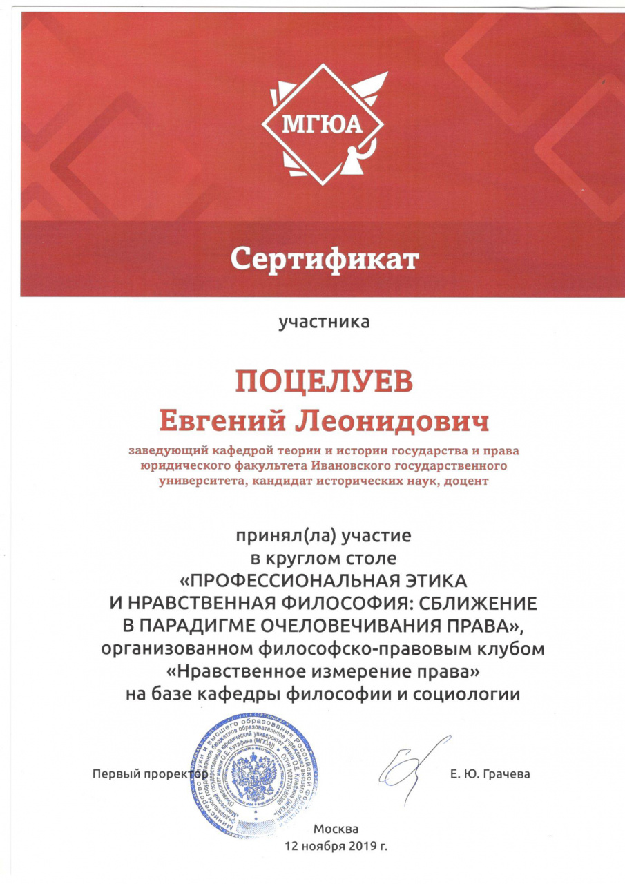 Сертификат Е.Л. Поцелуева, МГЮА. 12.11.2019