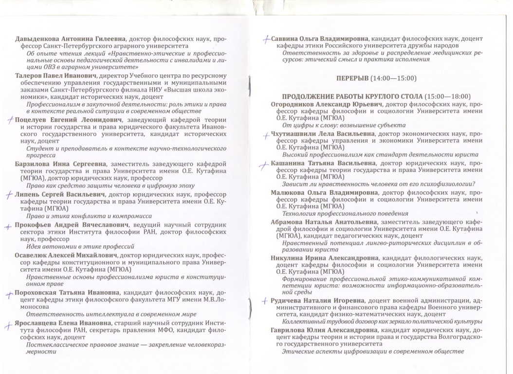 Высоконаучными, с органичным сочетанием доктрины и эмпирики, были доклады философов: ведущего научного сотрудника сектора этики Института философии РАН, д.ф.н., профессора Андрея Вячеславовича Прокофьева «Идея автономии в этике профессий», речь шла и об адвокатуре); к.ф.н., доцента кафедры этики философского факультета МГУ Татьяны Ивановны Пороховской («Ответственность интеллектуала в современном мире»); с.н.с. Института философии РАН, к.ф.н. Елены Ивановны Ярославцевой («Постнеклассическое правовое знание – закрепление человекорамерности»); к.ф.н., доцента кафедры этики Российского университета дружбы народов (РУДН) Ольги Владимировны Саввиных («Ответственность за здоровье и распределение медицинских ресурсов: этический смысл и практика исполнения»).