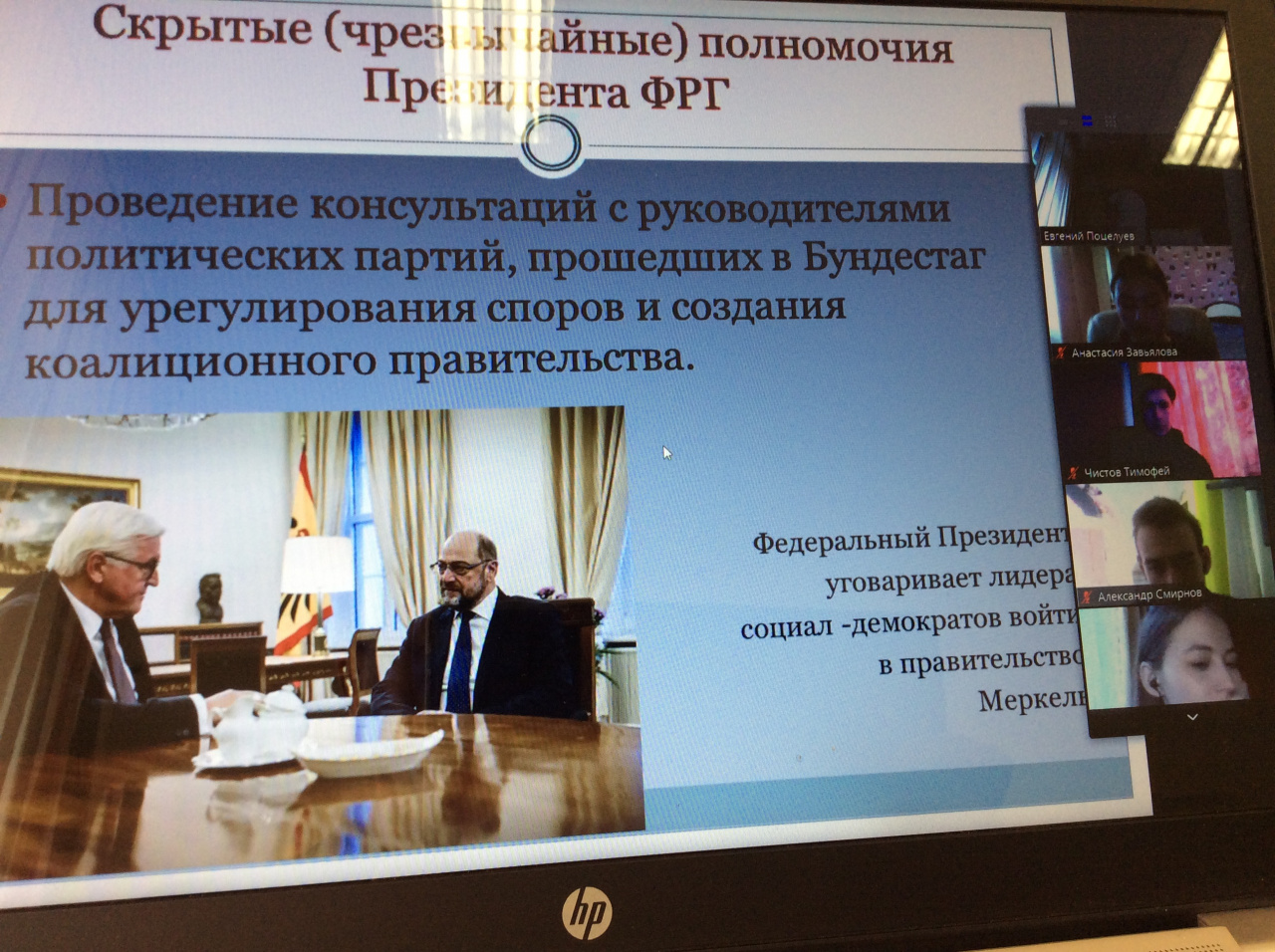 24 апреля 2021 г. в Zoom успешно прошла работа секции «Немецкоязычная правовая доктрина и правовая система ФРГ». На ней были заслушаны все запланированные доклады: «Рудольф Штаммлер о праве и государстве» (А.Н. Смирнов, член НОЦ «Межвузовский научно-исследовательский и образовательный Центр изучения немецкого права»); «Р. Иеринг – основатель науки о юридической технике» (Д.С. Меркурьева); «Чистое учение о праве Кельзена глазами современных российских ученых-юристов» (О.А. Тихомирова), «Судебная система ФРГ» (А.Р. Завьялова) (все – студенты первого курса или, как сказали бы немцы, второго семестра); «Роль Федерального Президента ФРГ в системе государственной власти Германии» (Д.А. Третьяков) и «Правовое регулирование наследственного договора по законодательству Германии, Австрии и Швейцарии» (Т.А. Чистов) (оба – студенты 4-го курса, члены Центра немецкого права). Все докладчики, кроме первого, подготовили презентации. Особенно удачный визуальный ряд был показан Денисом Третьяковым. Быстрым и предельно точным и конкретным был и его ответ на вопрос модератора секции, поэтому не случайно его доклад оказался лучшим. В апреле этот студент под руководством доцента Е.Л. Поцелуева принял участие в представительном научном молодежном форуме в МГУ им. М.В. Ломоносова.