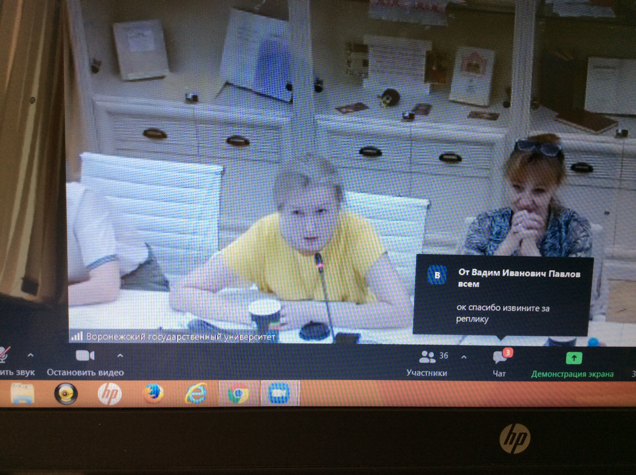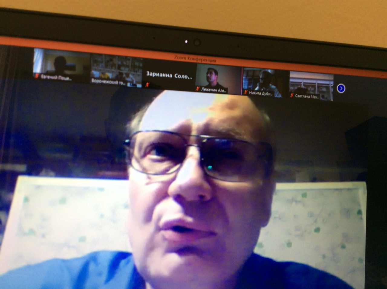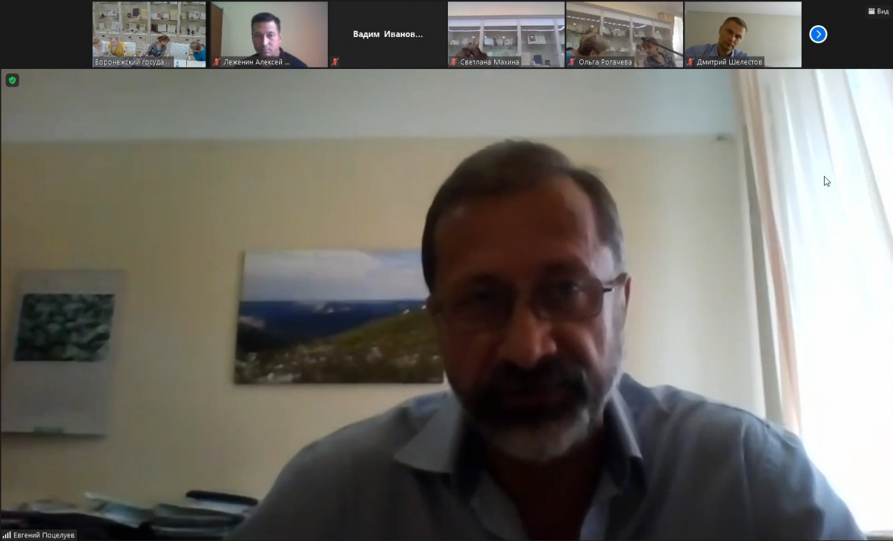 Доцент Е.Л. Поцелуев слушает вопрос от проф. Ю.В. Сорокиной на конференции в ВГУ. 30.06.2021