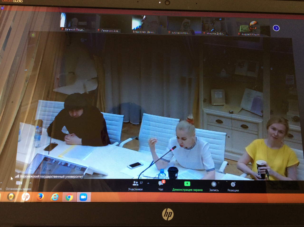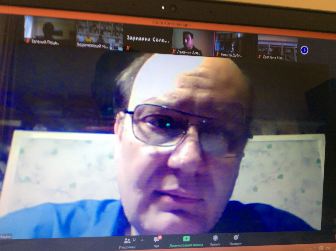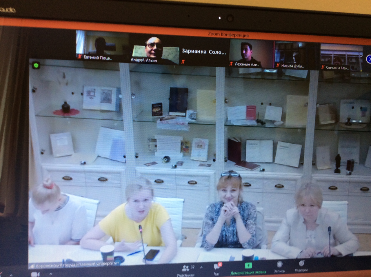 Доцент Е.Л. Поцелуев слушает вопрос от проф. Ю.В. Сорокиной на конференции в ВГУ. 30.06.2021