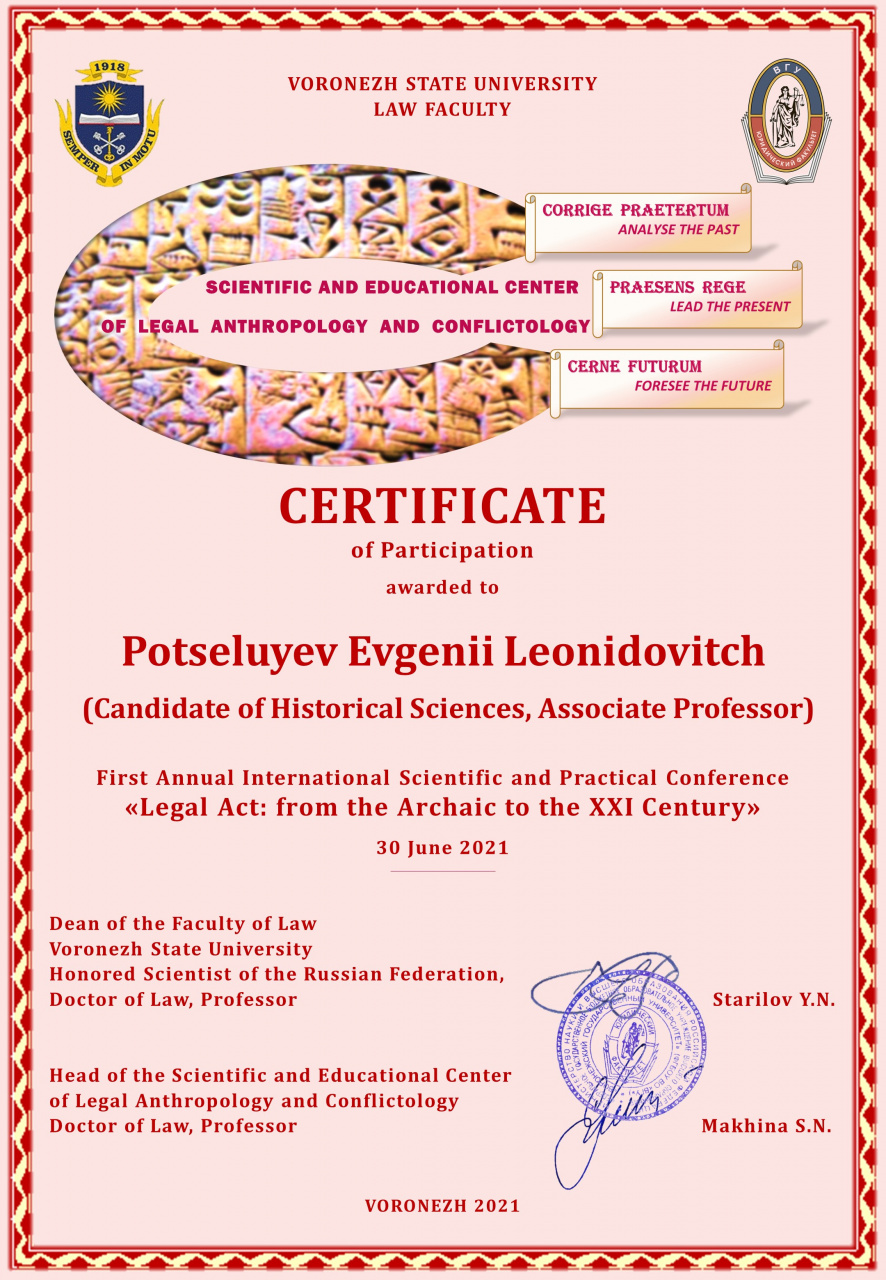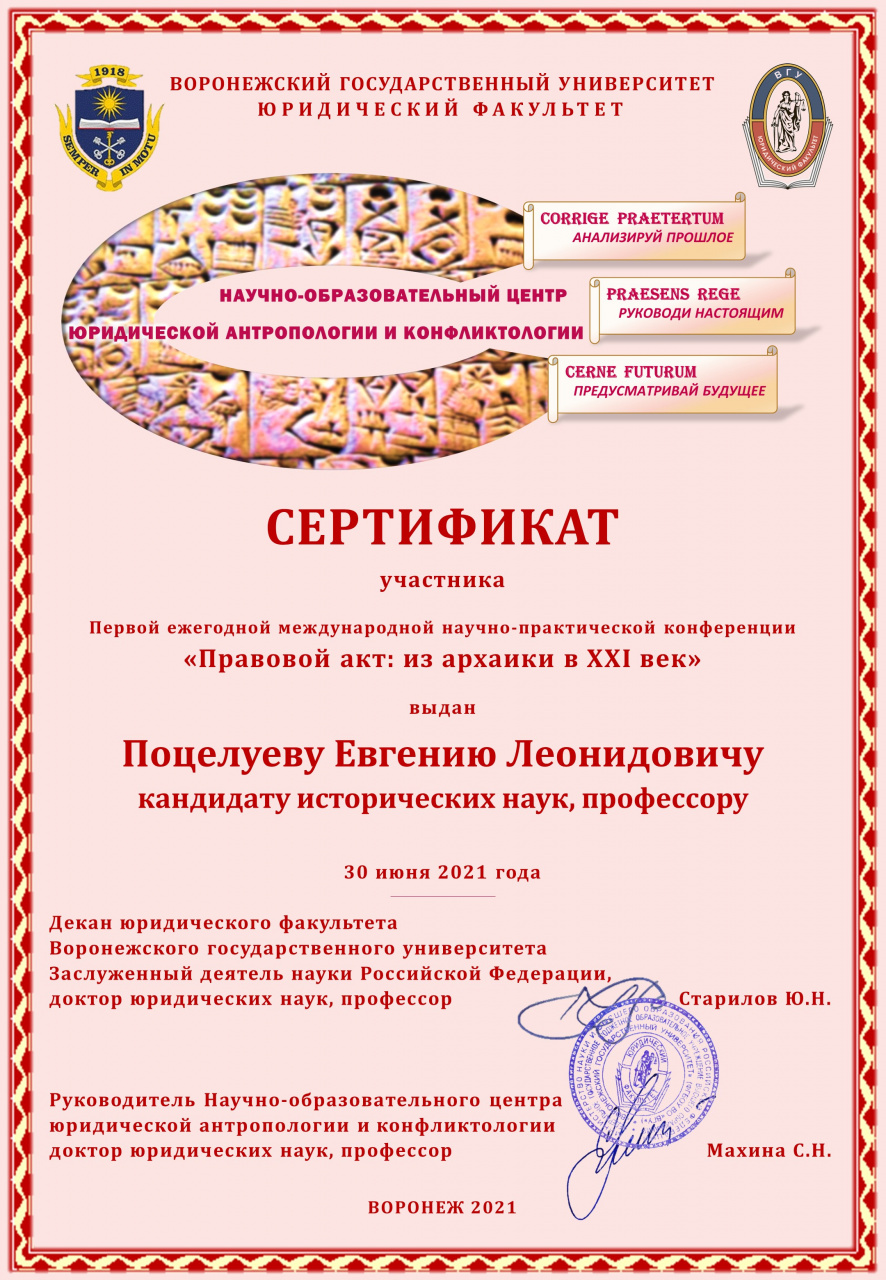 30 июня 2021 г. с 10:00 и до 18:50 в режиме «онлайн» проходила Первая ежегодная международная научно-практическая конференция «Правовой акт: из архаики в XXI век», организованная НОЦ юридической антропологии и конфликтологии юридического факультета Воронежского государственного университета (ВГУ).