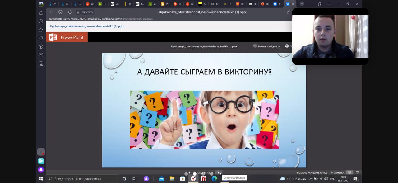 19 ноября 2021 года в рамках Всероссийского дня правовой помощи детям стажерами Центра студенческой правовой помощи (юридической клиники) (руководитель Н.В. Исаева) Ивановского государственного университета и научным сотрудником НОЦ ИвГУ «Доступная правовая среда» Я.А. Куликовой был проведен просветительско-правовой мастер-класс для учащихся 7-х и 9-х классов лицея № 22 г. Иваново на тему: «Уголовная ответственность несовершеннолетних».