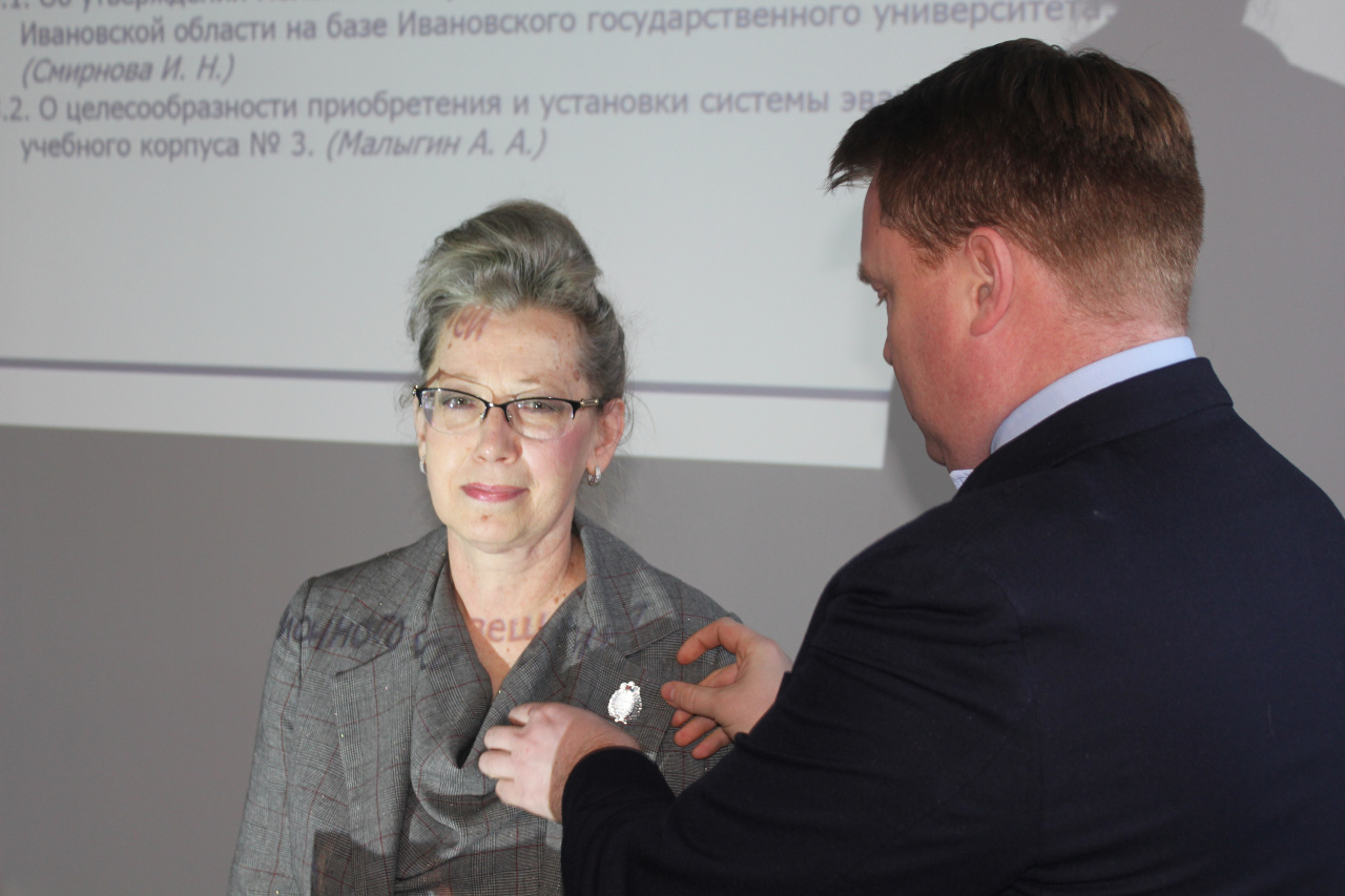 29 декабря 2021 г. на расширенном заседании Ученого совета ИвГУ ректор университета А.А. Малыгин по поручению Губернатора Ивановской области С.С. Воскресенского вручил кандидату юридических наук, доценту, заведующему кафедрой уголовного права и процесса, первому проректору О.В. Кузьминой нагрудный знак «Почетный юрист Ивановской области» в связи с присвоением ей этого звания и тепло поздравил с ведомственной наградой. Члены Ученого совета пожелали Ольге Владимировне получить теперь награду федерального уровня!