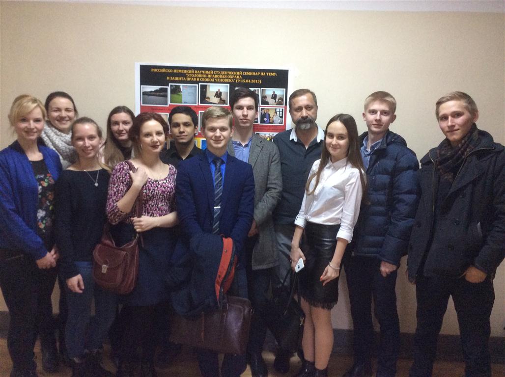 24 марта 2017 г. на юридическом факультете под председательством руководителя Центра немецкого права, канд. ист. наук, доцента Евгения Леонидовича Поцелуева прошла встреча студентов юридического факультета с пятью студентами философского факультета Университета Пассау (ФРГ). Участники встречи общались на нескольких языках. Все гости владеют в разной степени русским, но предпочитали общаться преимущественно на английском. Важную роль в коммуникации сыграл студент 4 курса Александр Меркуленко, переводивший с английского на русский и наоборот. Евгений Леонидович и Елизавета Комарова вели дискуссию на немецком.