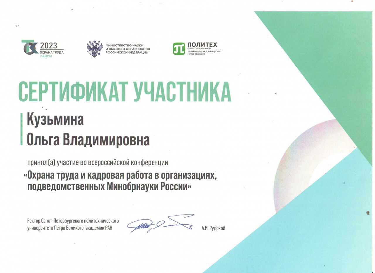 Министерство науки и высшего образования Российской Федерации 22-23 июня 2023 года на базе ФГАОУ ВО «Санкт-Петербургский политехнический университет Петра Великого» провело Всероссийскую конференцию «Охрана труда и кадровая работа в организациях, подведомственных Минобрнауки России». Этот университет первым в России в 1902 году начал подготовку специалистов по охране труда - фабричных инспекторов. Цель Конференции состояла в обсуждении изменений российского законодательства в области охраны труда и кадровой работы; вопросов обеспечения безопасного образовательного процесса, совершенствования системы управления охраной труда и кадровой работы в организациях, подведомственных Минобрнауки России, а также организации исполнения процедуры управления профессиональными рисками. Решение данных проблем позволит сформировать единый подход к поддержанию безопасности условий труда работников и обучающихся вузов, избежать ошибок в деятельности кадровых подразделений. В Конференции приняли участие представители образовательных и научных организаций страны, среди которых была и первый проректор Ивановского государственного университета О.В. Кузьмина.