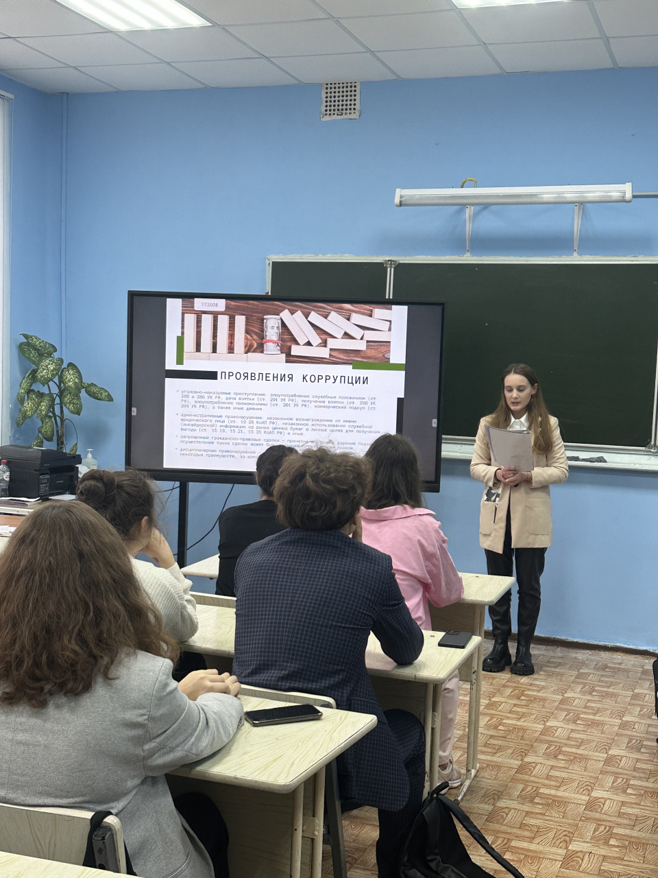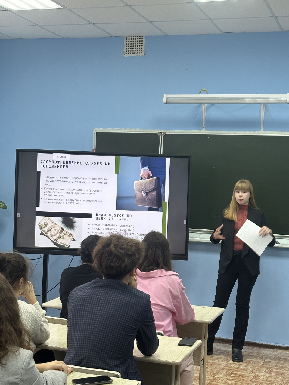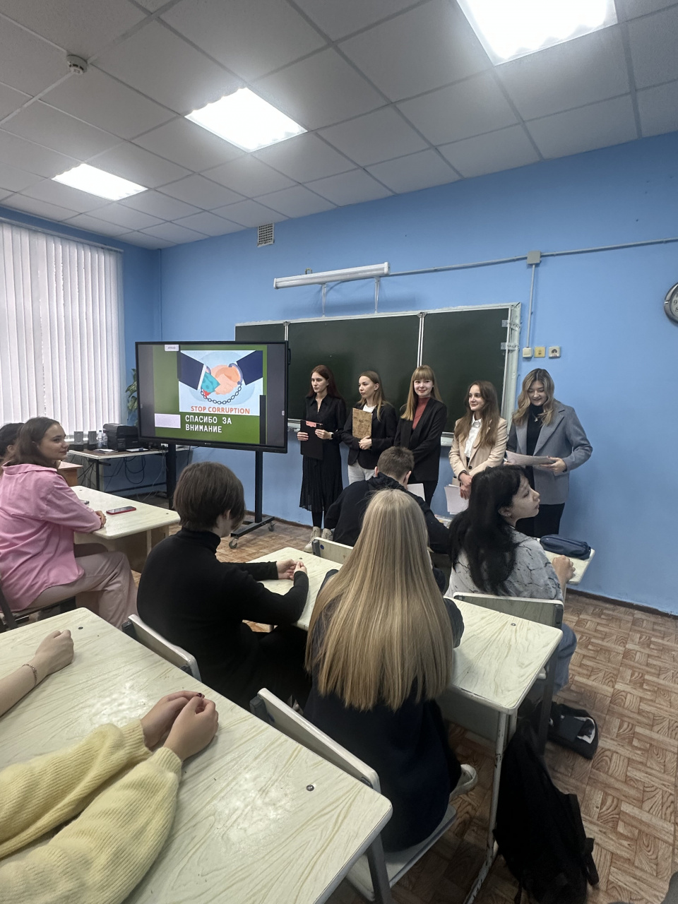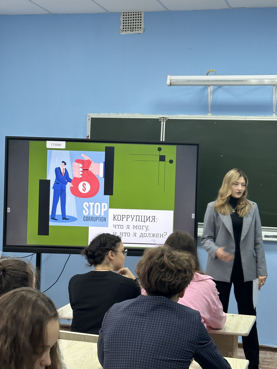 27 октября 2023 года студентами 3-го курса юридического факультета ИвГУ и руководителем организационно-правового направления ЮК НОЦ «Доступная правовая среда» ИвГУ Куликовой Яной Алексеевной для учащихся школы № 58 г. Иваново проведен мастер-класс на тему «Коррупция: что я могу? И что я должен? в рамках Всероссийской общественной акции по оказанию юридической помощи по вопросам применения антикоррупционного законодательства «День бесплатного антикоррупционного консультирования».
