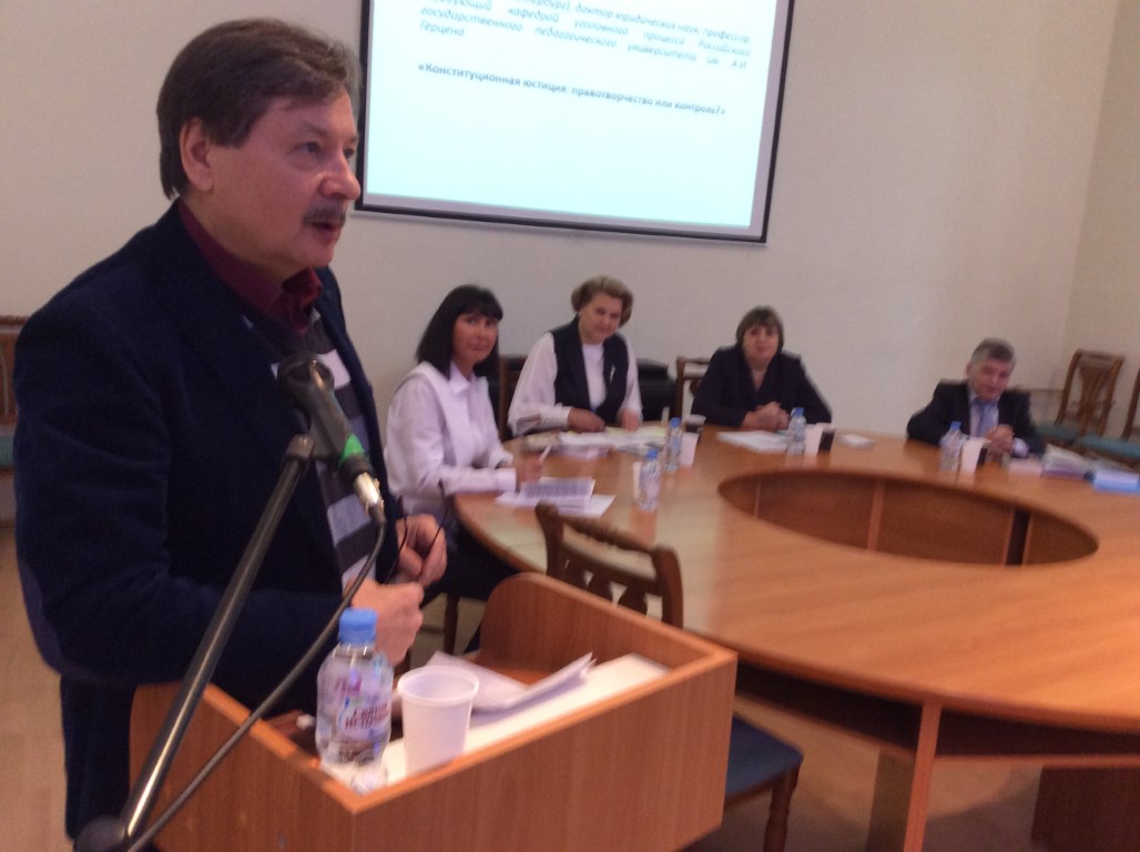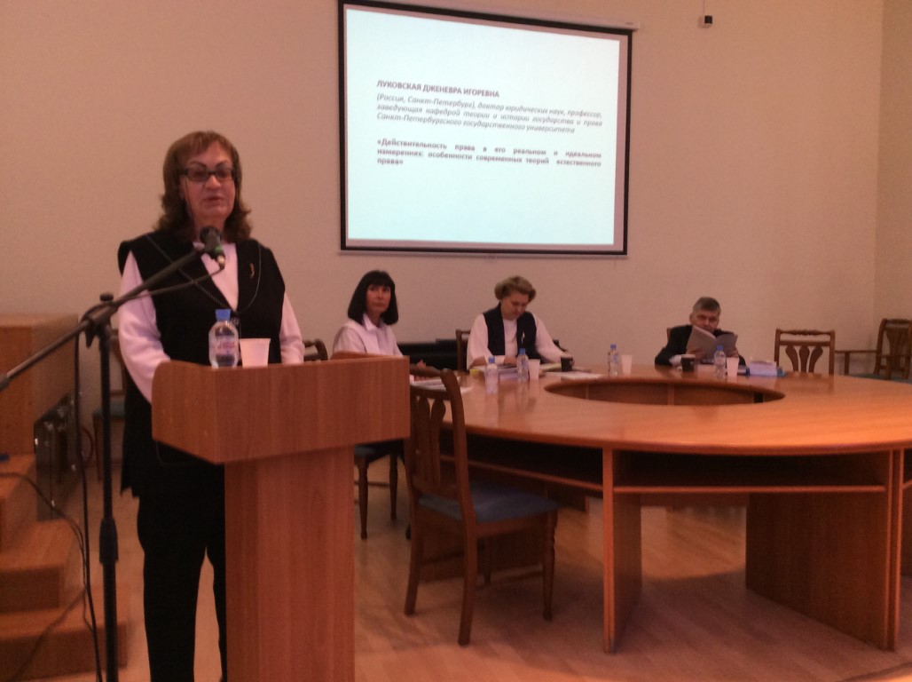 23 ноября с докладами на пленарном заседании конференции выступили известные в нашей стране и за ее пределами ученые: доктора юридических наук, профессора Людмила Ивановна Глухарева (заведующий кафедрой теории права и сравнительного правоведения Российского государственного гуманитарного университета, неоднократный участник международных конференций на юрфаке ИвГУ, проводимых доцентом Е.Л. Поцелуевым), Дженевра Игоревна Луковская (заведующий кафедрой теории и истории государства и права Санкт-Петербургского государственного университета, далее – СПбГУ), Андрей Васильевич Поляков (профессор той же кафедры, автор коммуникативной теории права, ученый с мировым именем), Илья Львович Честнов (профессор кафедры теории и истории Санкт-Петербургского юридического института (филиала) Университета прокуратуры Российской Федерации, автор диалоговой теории права), Ирина Борисовна Ломакина (с той же кафедры), Александра Андреевна Дорская и др. Очень содержательным и ярким, образным по форме (с использованием японской поэзии) был доклад доктора юридических наук, профессора, заведующего кафедрой уголовного процесса РГПУ им. А.И. Герцена, председателя Совета Международной ассоциации содействия правосудию, советника Конституционного Суда Российской Федерации, Заслуженного юриста РФ Александра Витальевича Смирнова (выпускника № 1 ИвГУ в 1979 году). Он рассуждал на важную и актуальную тему: конституционная юстиция: правотворчество или контроль?
