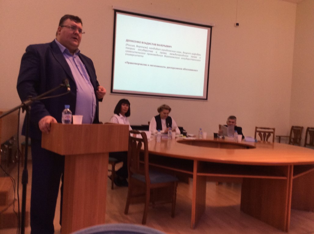 Из докладов, прозвучавших 24 ноября, выделялся доклад кандидата юридических наук, доцента кафедры теории и истории права и государства Волгоградского института управления – филиала Российской академии народного хозяйства и государственной службы при Президенте РФ Юрия Юрьевича Ветютнева (участник почти всех международных конференций за последние годы на юрфаке ИвГУ, организуемых доцентом Е.Л. Поцелуевым). Тема его выступления – «Аксиологические основания правотворческой процедуры». Ю.Ю. Ветютнев – один из немногих докладчиков, чье выступление сопровождала небольшая презентация.