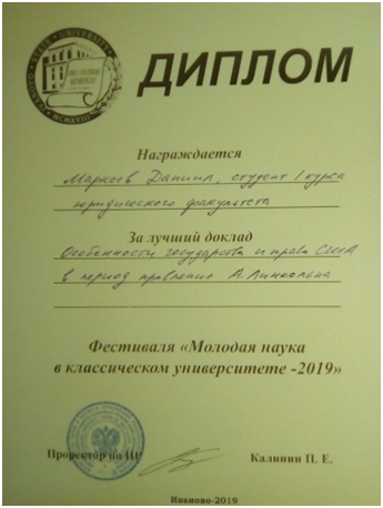 Дипломами за лучшие доклады награждены студенты первого курса Александр Голубев, раскрывший тему «“Гири” в правовой культуре Японии: история и современность», и Даниил Маркеев с темой «Особенности государства и права США в период правления А. Линкольна». Тезисы докладов будут опубликованы в сборнике конференции.
